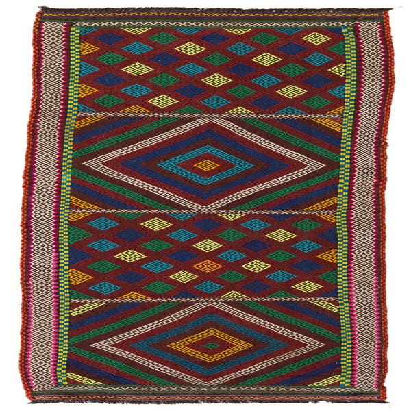 The Kilim Fars 8 Ft Runner is a hand-knotted textile that exemplifies traditional craftsmanship and timeless appeal. Crafted from 100% wool, the rug showcases a geometric pattern composed of diamond motifs that are skillfully outlined and filled with a multitude of vivid colors including red, beige, blue, brown, ivory, yellow, and light blue, all set against a rich red background. The bold, linear design is framed by a detailed border that echoes the primary pattern's angular aesthetic.