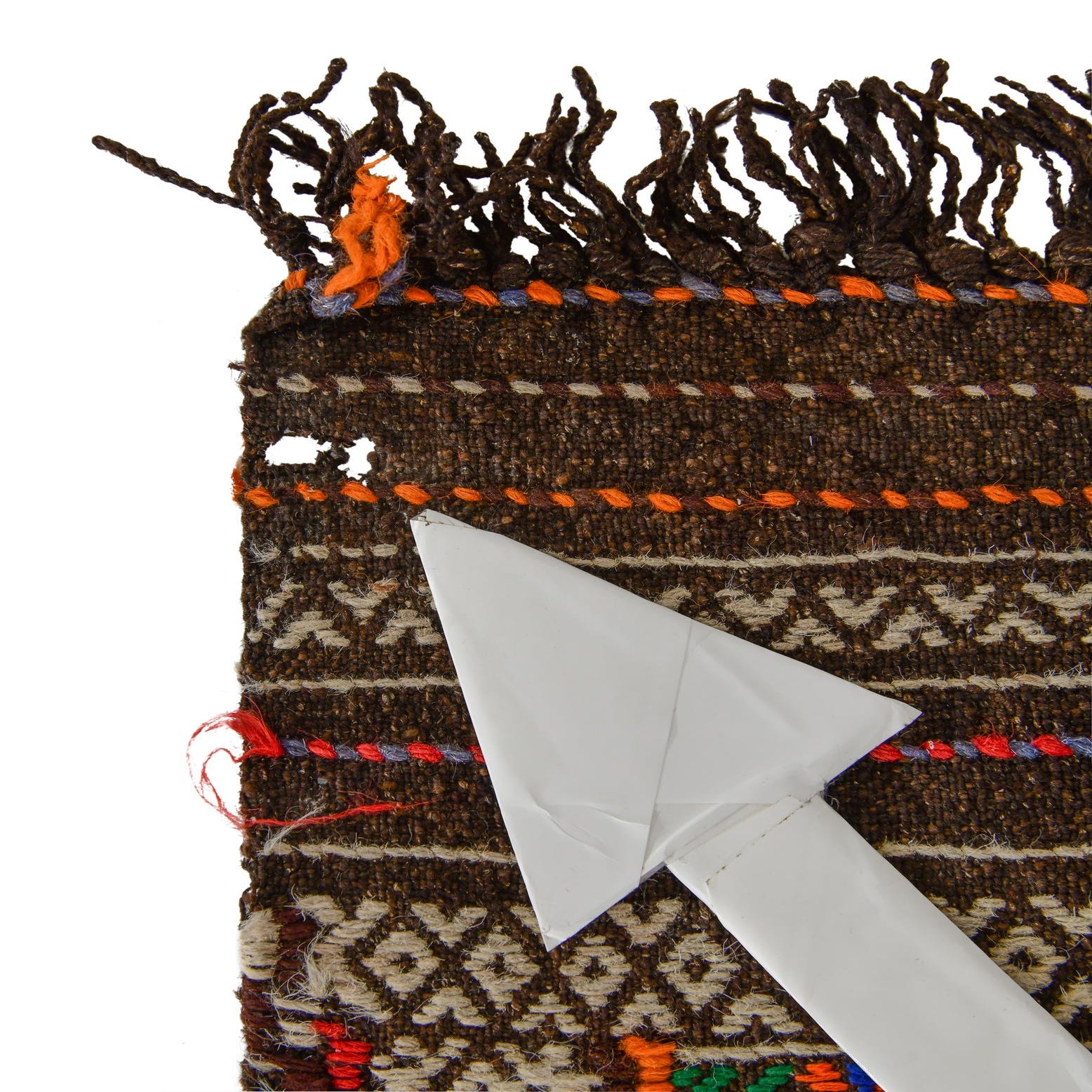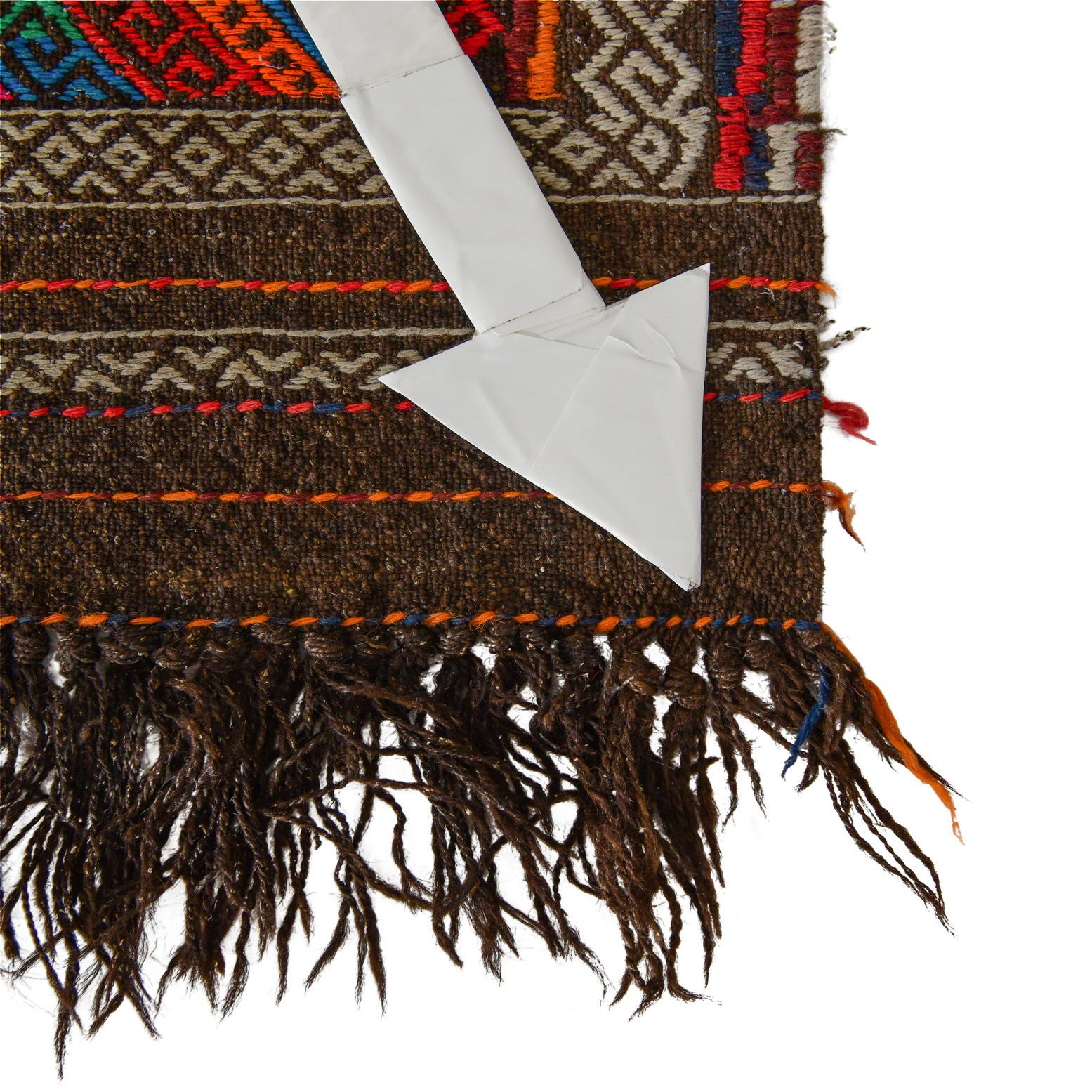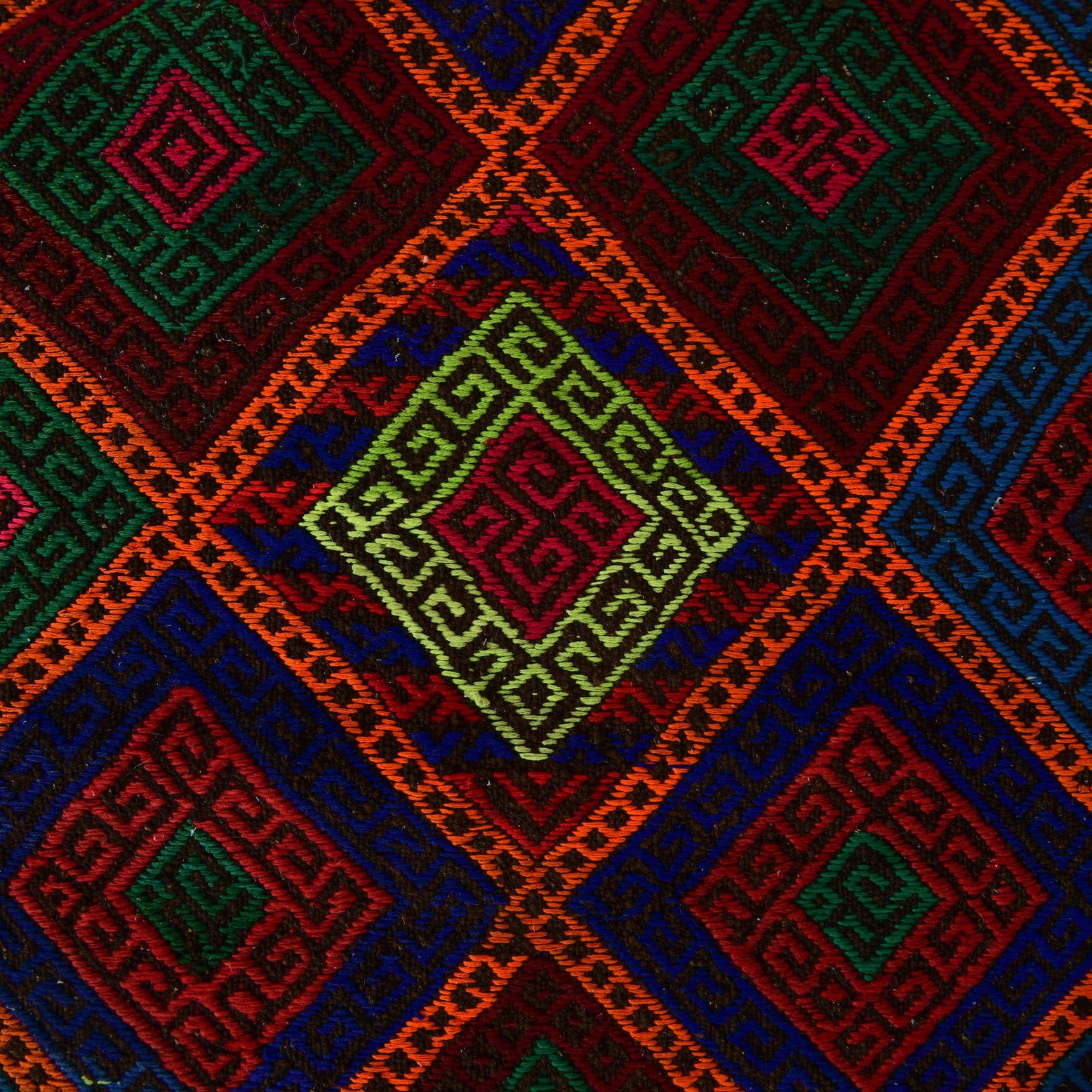 Primary color is Red. Colors in this rug include: Red, Black, Blue, Brown, Green, Orange, Yellow, Pink.