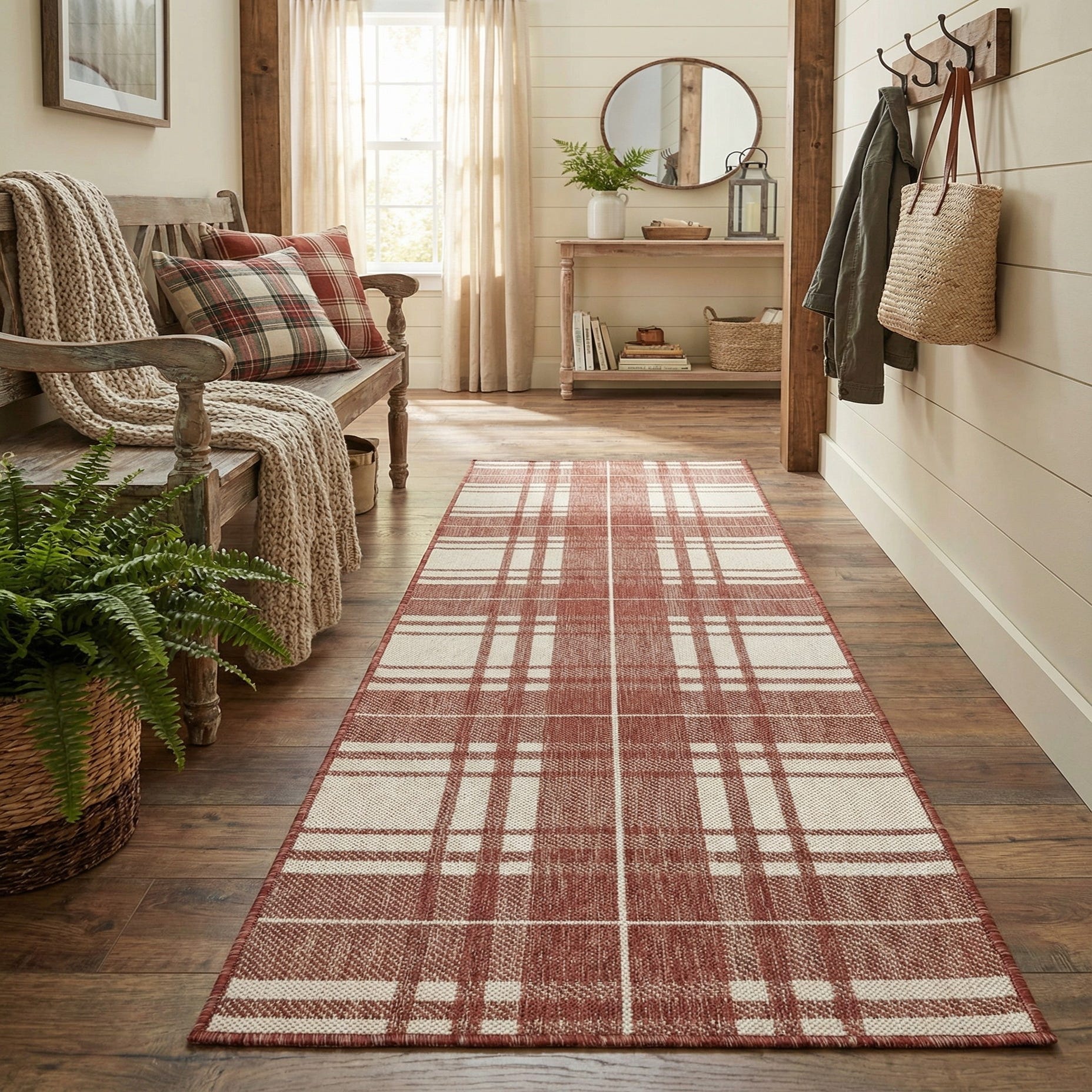 A long 8 ft runner rug with a modern red and cream plaid pattern, suitable for a hallway or patio.