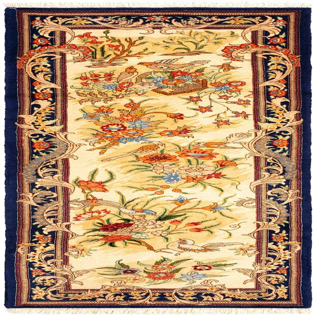 This hand-woven wool runner carries a classic Persian-inspired motif: a scrolling field of stylized flowers, vines and small birds arranged in an open, meandering composition and held inside a layered, foliate border. The background is a rich red, offset by a deep navy outer border and highlighted with cream, gold, orange, sky blue and leaf-green accents that define each blossom and feather. The hand-woven wool construction yields a tightly woven, low-pile surface with a smooth, tactile finish that keeps the pattern crisp while offering a comfortable underfoot feel.