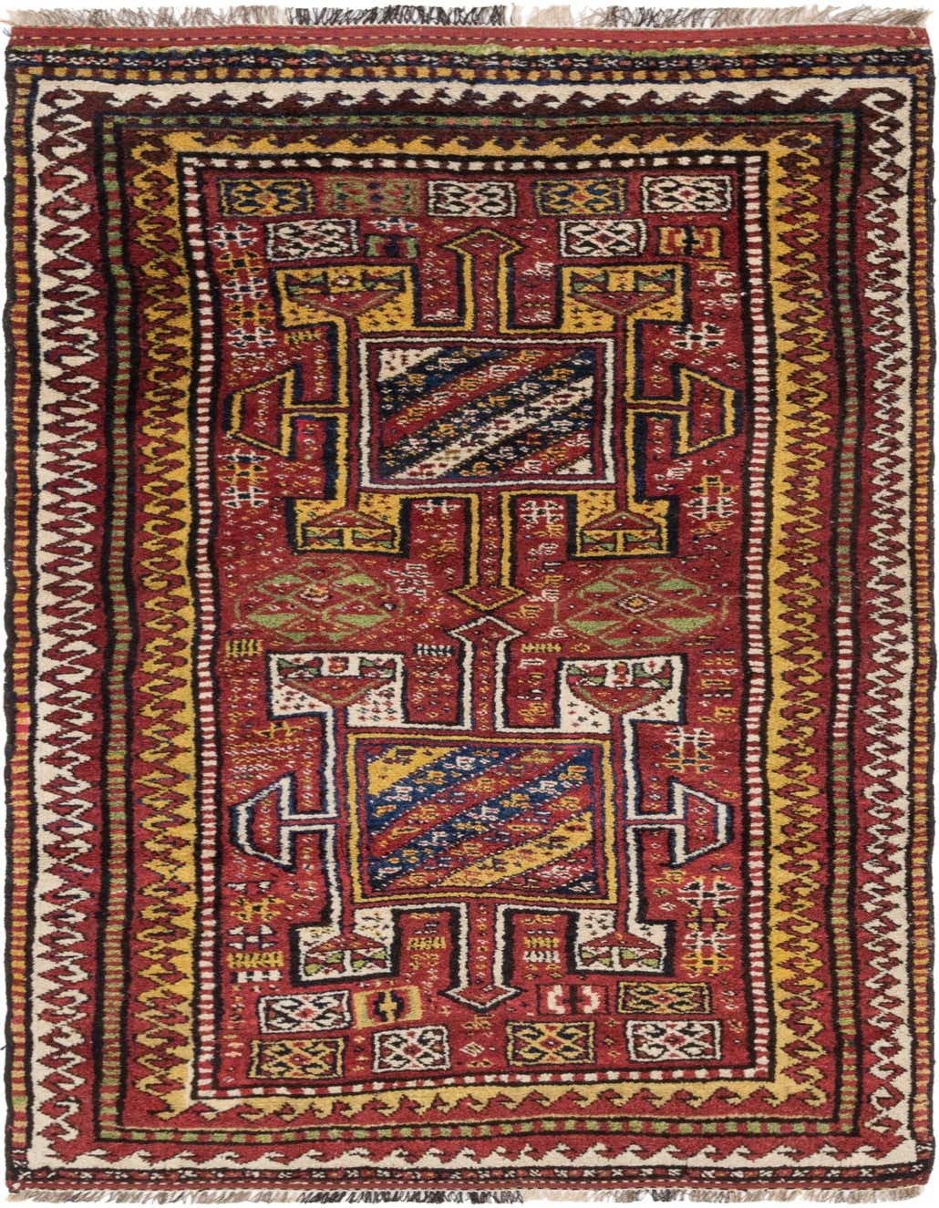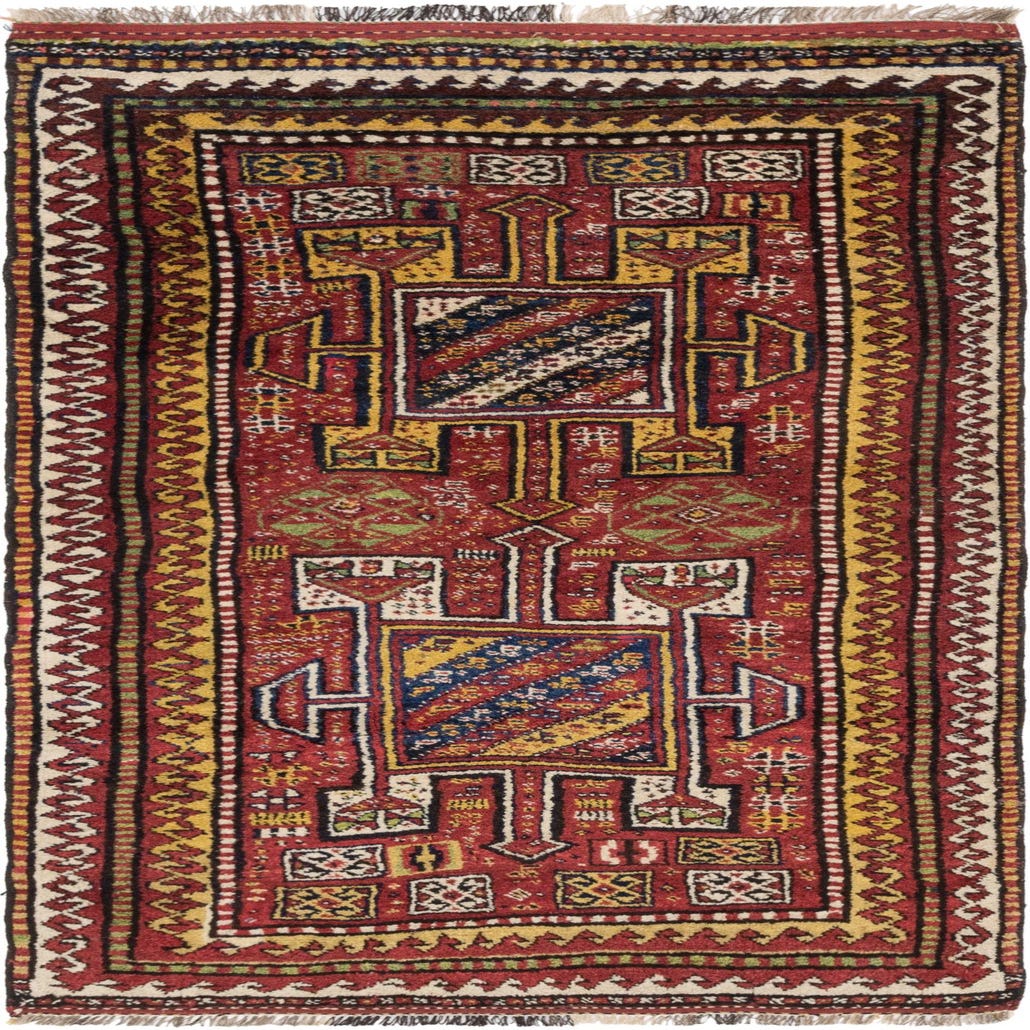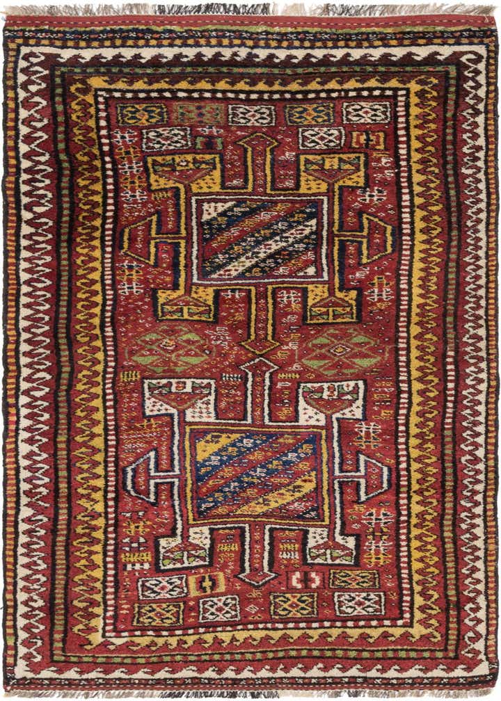 Primary color is Red. Colors in this rug include: Red, Blue, Ivory, Yellow, Black.