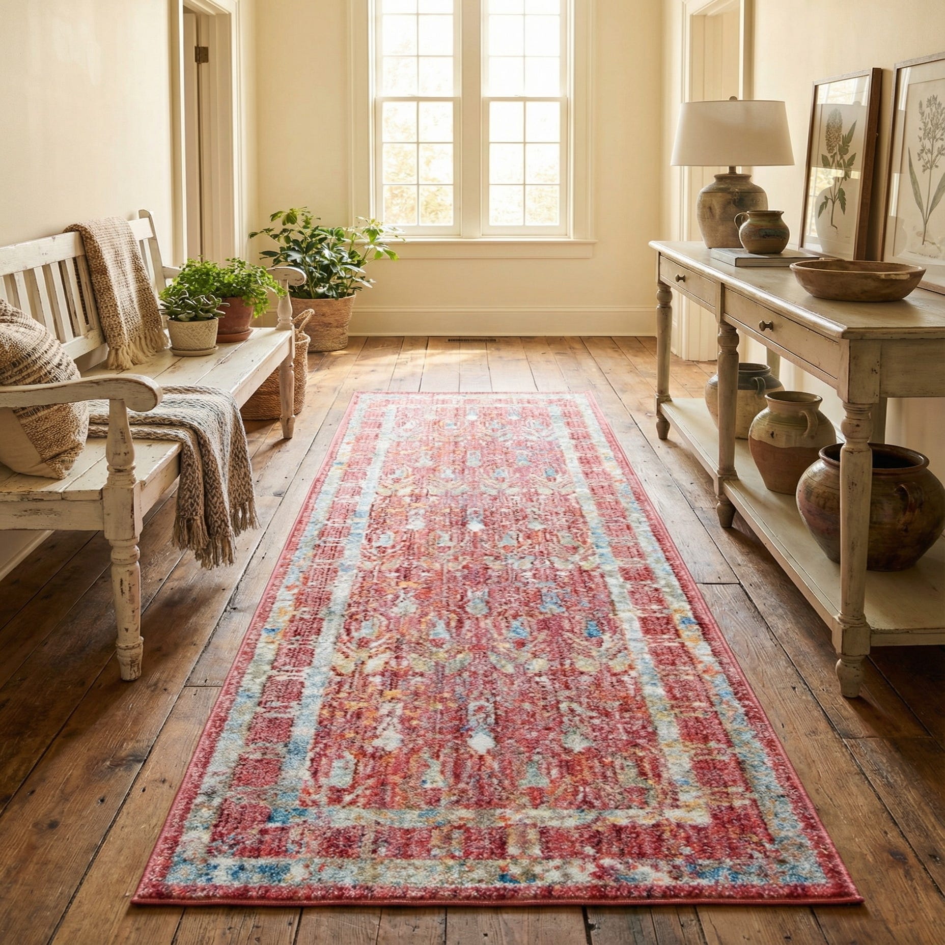 Machine Made of 100% Polyester (Space-Dyed Yarn), the surface feels soft underfoot with a low-pile construction that offers a smooth, slightly cushioned touch and a gentle sheen from the yarn. As a runner, it brings color and warmth to hallways and entryways, works well along kitchen aisles, or anchors a narrow bedside area. Pair it with warm wood floors and neutral upholstery for a cozy, layered feel, or use it to introduce color into a transitional, bohemian, or cottage-style scheme—accent with muted gold hardware or soft blue and green textiles to echo the rug’s secondary tones.