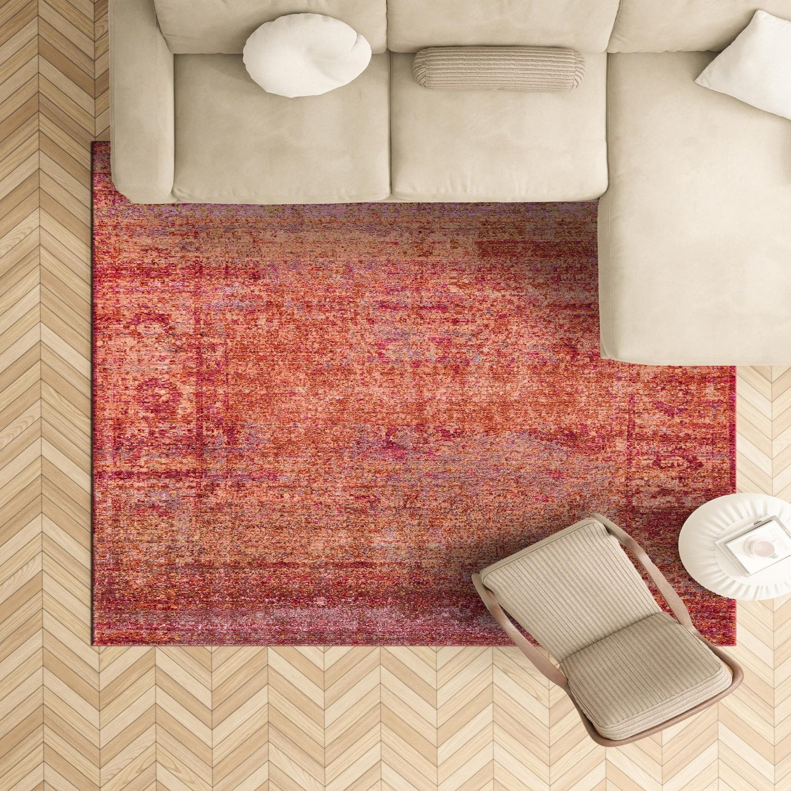 A machine-made rug woven from 100% polyester, this piece presents a low-pile, softly textured surface with a gentle sheen you can feel beneath your feet. The design blends a faded, vintage-style motif with a painterly, distressed finish: a subtle medallion and border suggestion drifts into an allover, mottled field. The red background anchors the composition while layers of beige, burgundy, gray, olive, puce, purple and touches of yellow create depth and a colorwashed effect that reads like a well-loved heirloom.