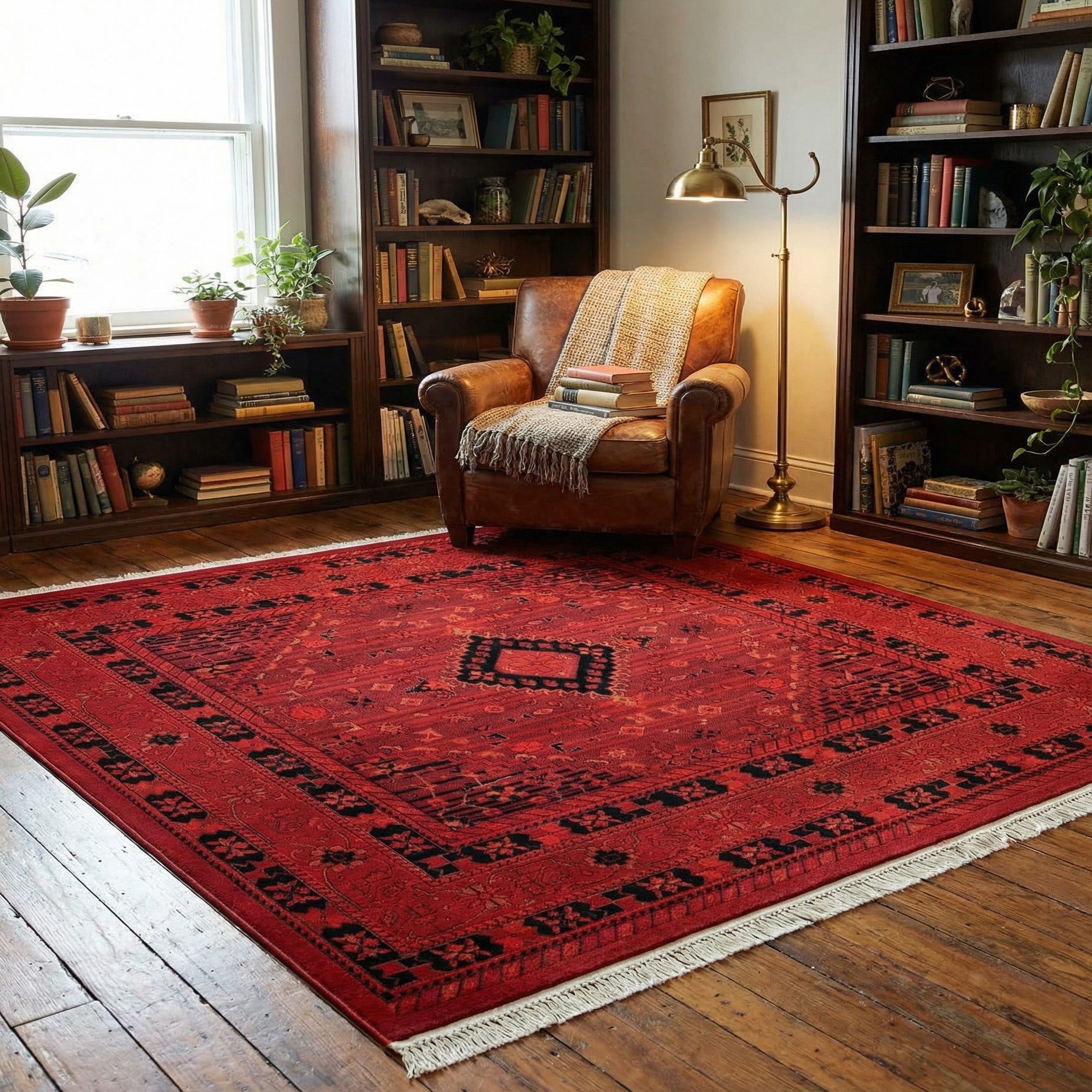 Machine-made from 100% polypropylene, the rug has a low, dense pile that feels smooth and slightly springy underfoot, with color depth that remains consistent across the surface. It works well anchored beneath a seating group or under a dining table, and pairs naturally with warm wood finishes, leather furniture, or neutral upholstery to balance the saturated red. Use it to add traditional character to a living room, to warm a home office with darker furnishings, or as a grounding element in an eclectic space layered with textured textiles.