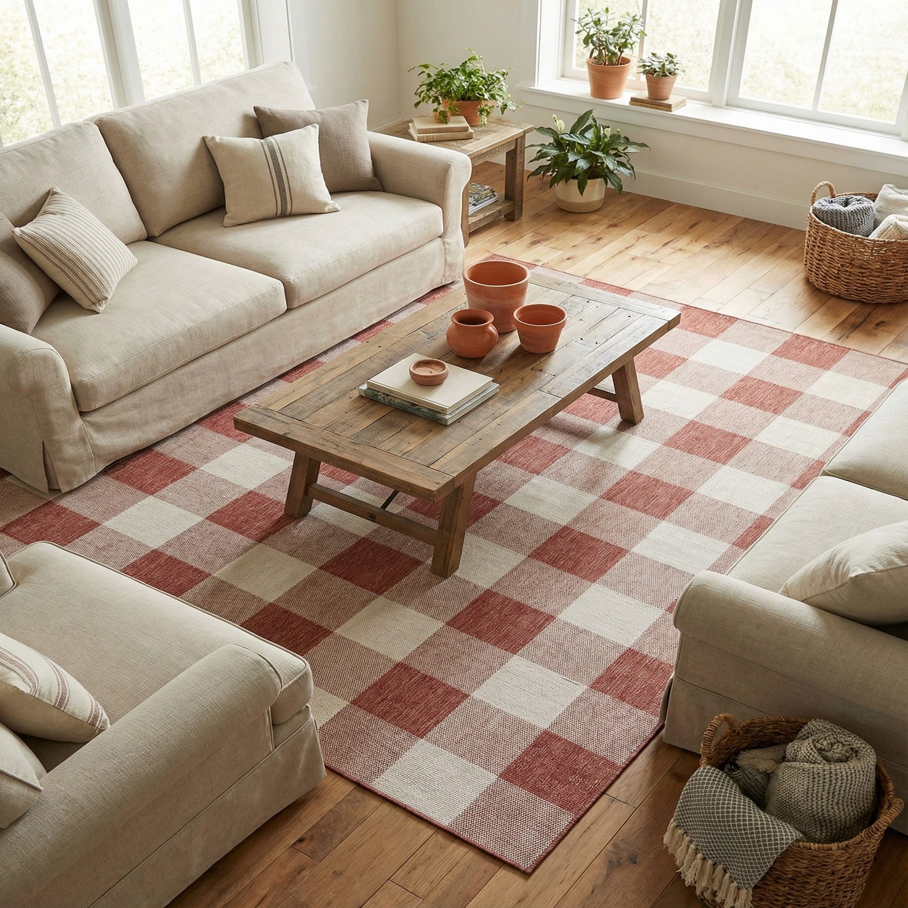 This Outdoor Checkered rug would work best in spaces that aim to achieve a cozy yet vibrant ambiance, such as patios, decks, sunrooms, and casual living areas. The rug's distinctive pattern and color scheme can act as a focal point in minimalist designs or complement bolder decor styles that feature solid colors or natural textures.