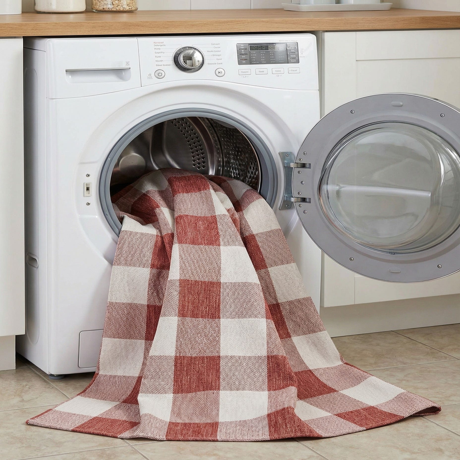A 7' 10 x 7' 10 square red and white checkered rug with a flatweave texture, suitable for indoor or outdoor use.