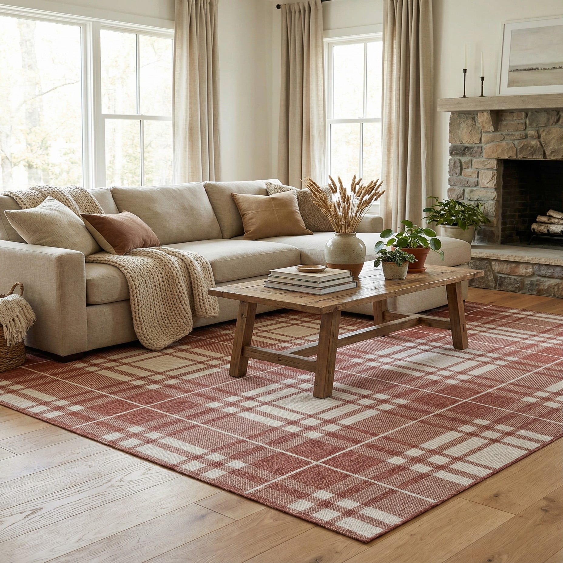A 7' 10 x 7' 10 square red and white checkered rug with a modern plaid pattern, suitable for indoor or outdoor use.