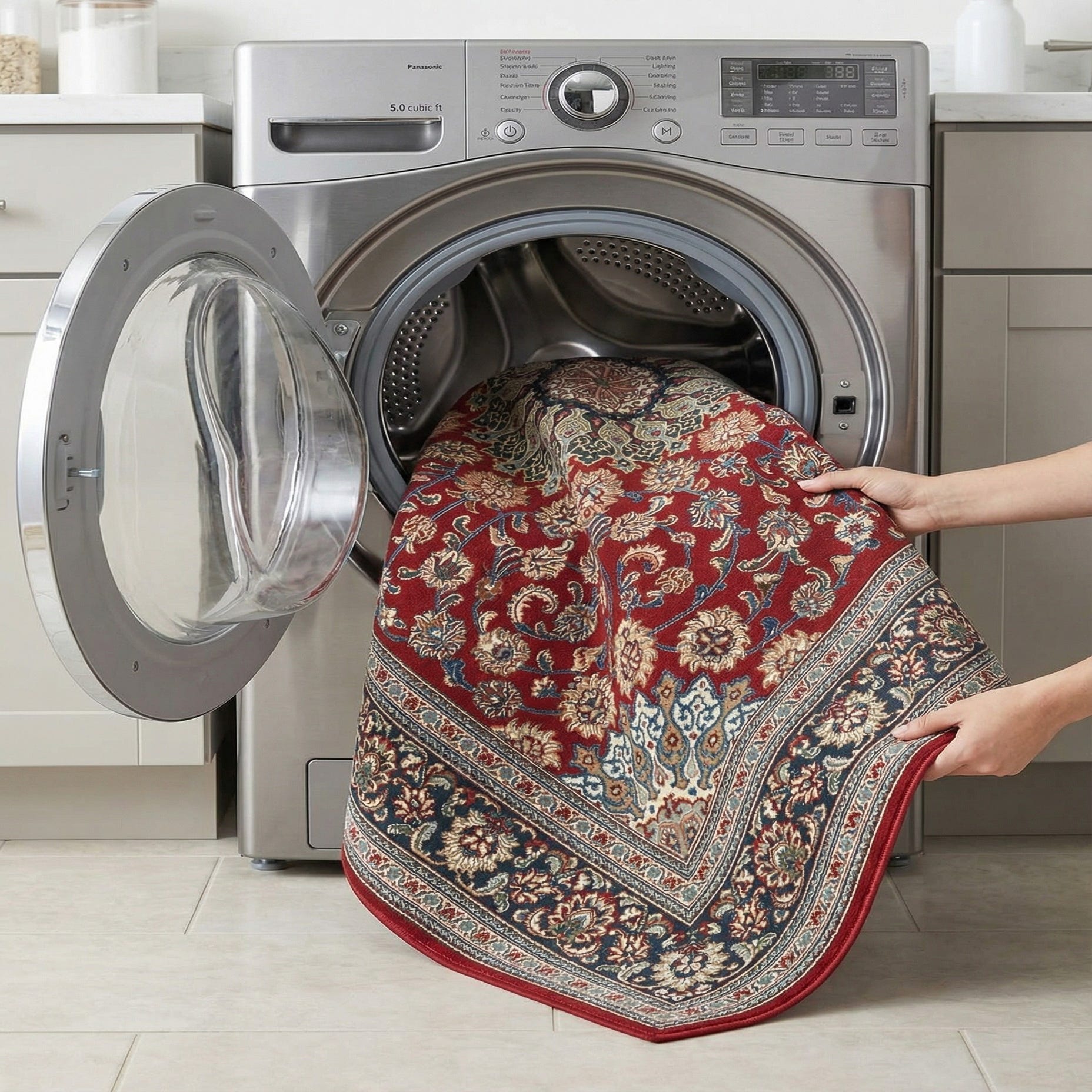 This piece pairs naturally with traditional and transitional interiors — think a wood dining table, leather seating, or a formal living area with navy or beige upholstery. It also works well in a covered patio or sunroom where classic patterning is desired; use it to ground a conversation group, define a dining space, or layer over a larger neutral flooring to add color and structure. The balanced palette and structured motif make it easy to coordinate with warm wood tones, brass accents, and deep-hued fabrics.