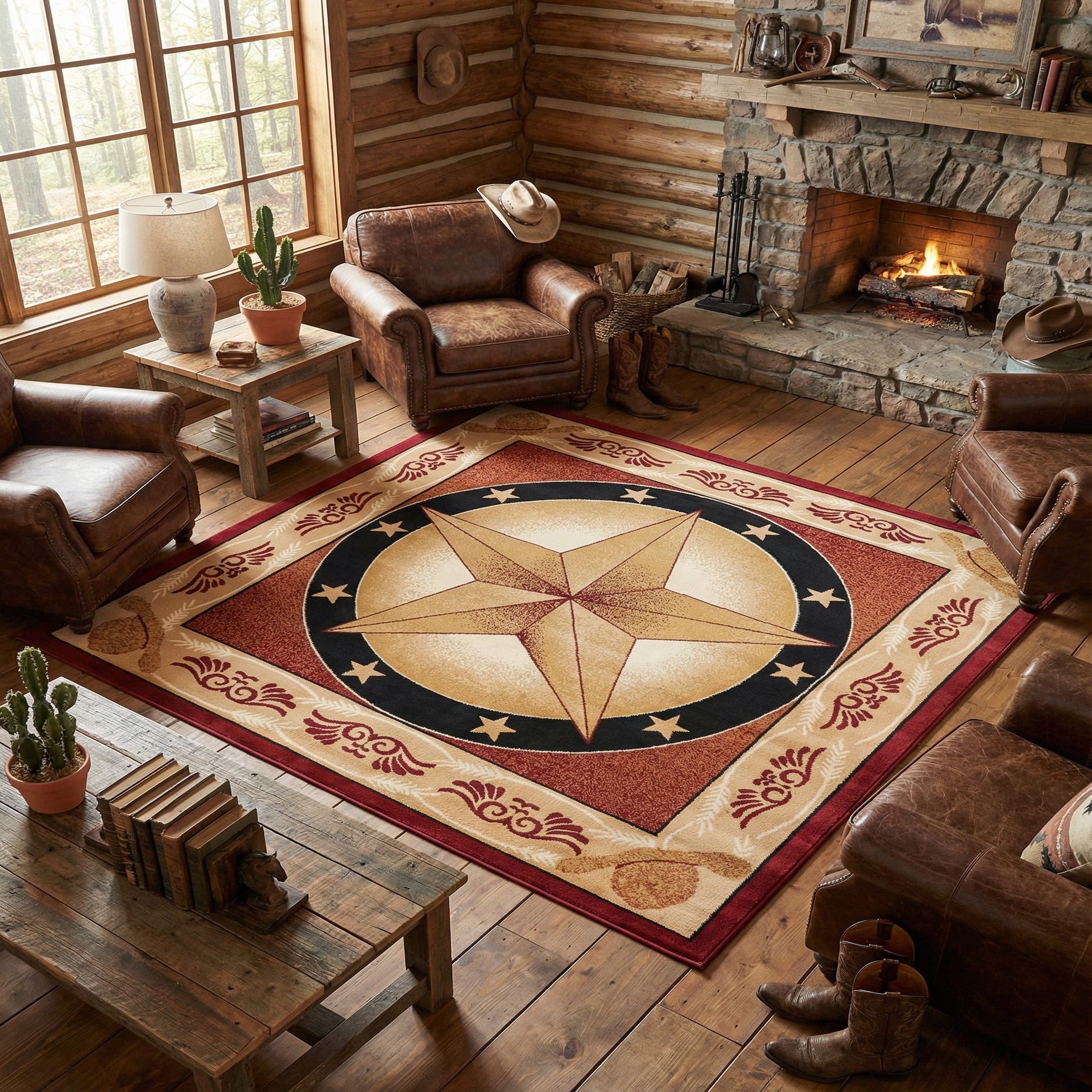 A bold red field anchors a classic five-point star medallion in warm gold and beige, framed by a black ring dotted with smaller stars. The surrounding beige border carries scrollwork, wheat-like sprigs and hat silhouettes in brown and ivory, giving the rug a definite Western-inspired character. Machine made from 100% polypropylene, the low, dense pile feels smooth underfoot and keeps the pattern well-defined for everyday use.