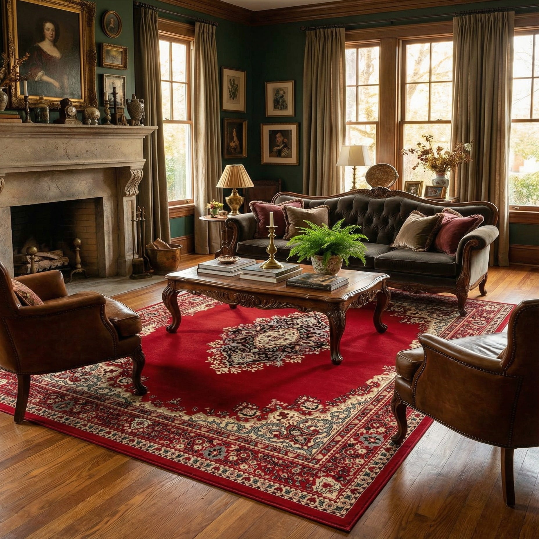 The Amaya rug's classic styling makes it suitable for various decor scenarios including traditional, vintage, or eclectic spaces. It could serve as a statement piece in a living room, providing a pop of color and a sophisticated focal point or be used to add warmth and definition in a dining area. The bold red can also complement neutral color schemes by adding depth and contrast. This rug has the potential to anchor furniture and create a cohesive look in an interior while still standing as an impressive design element in its own right.