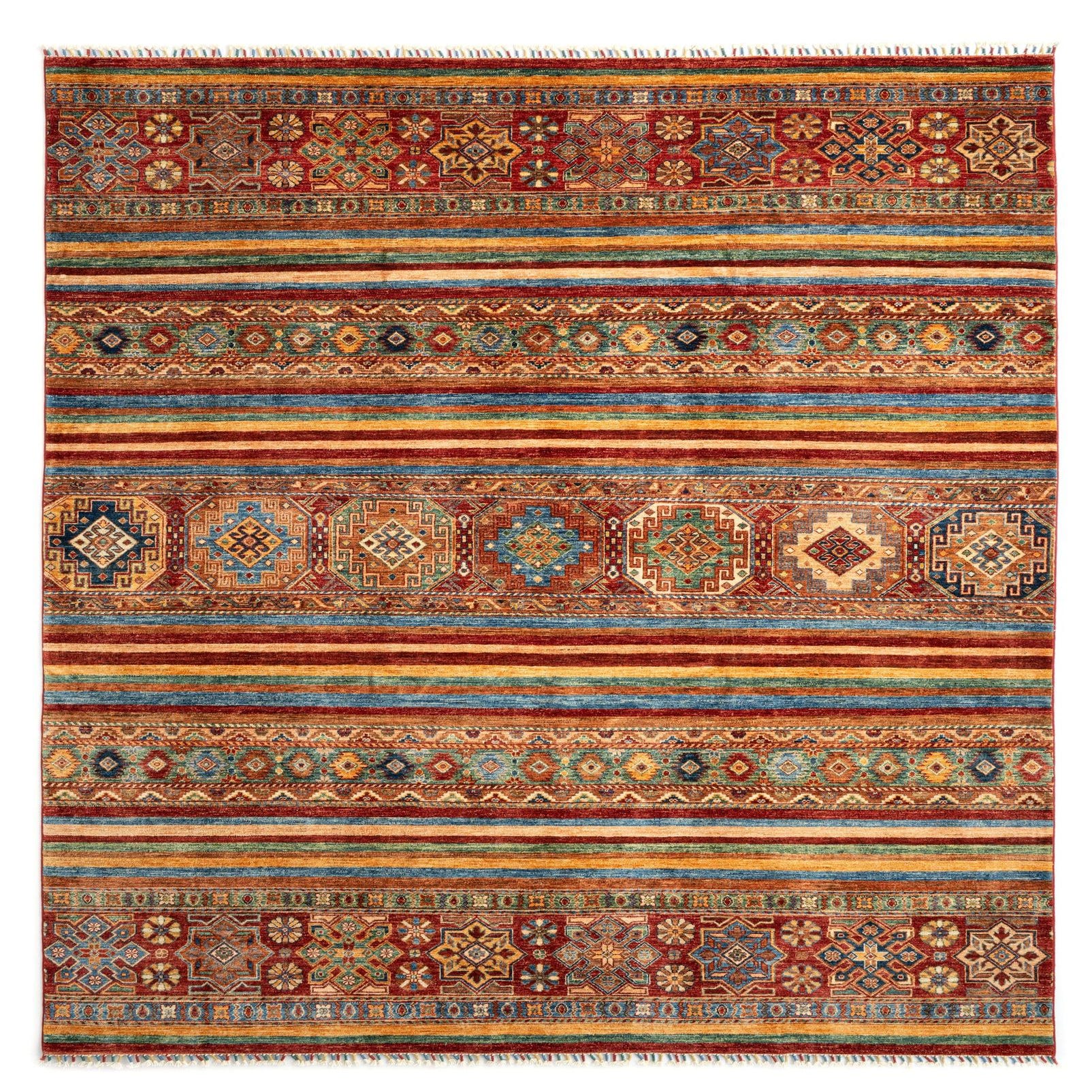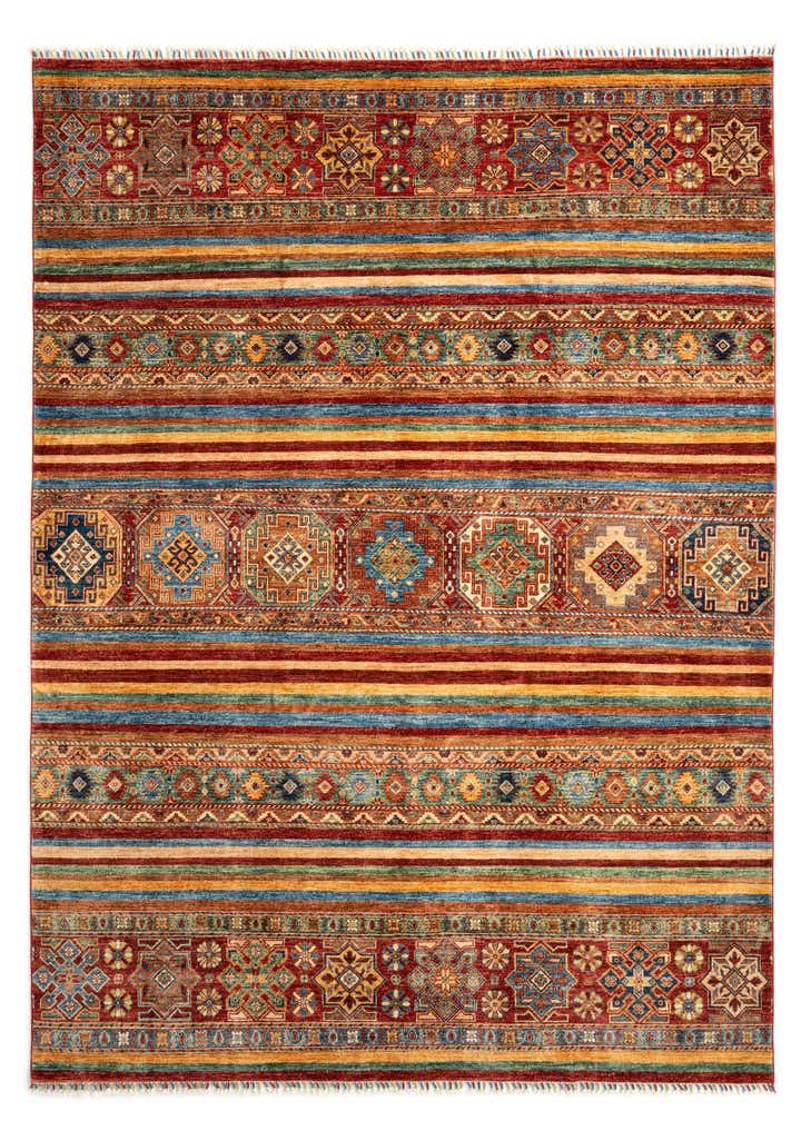 Primary color is Red. Colors in this rug include: Red, Red, Beige, Brown, Green, Blue, Orange.