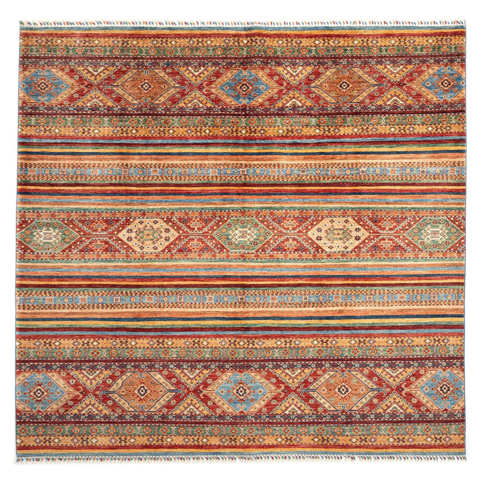 Primary color is Red. Colors in this rug include: Red, Red, Brown, Green, Orange, Blue, Yellow, Dark Blue.