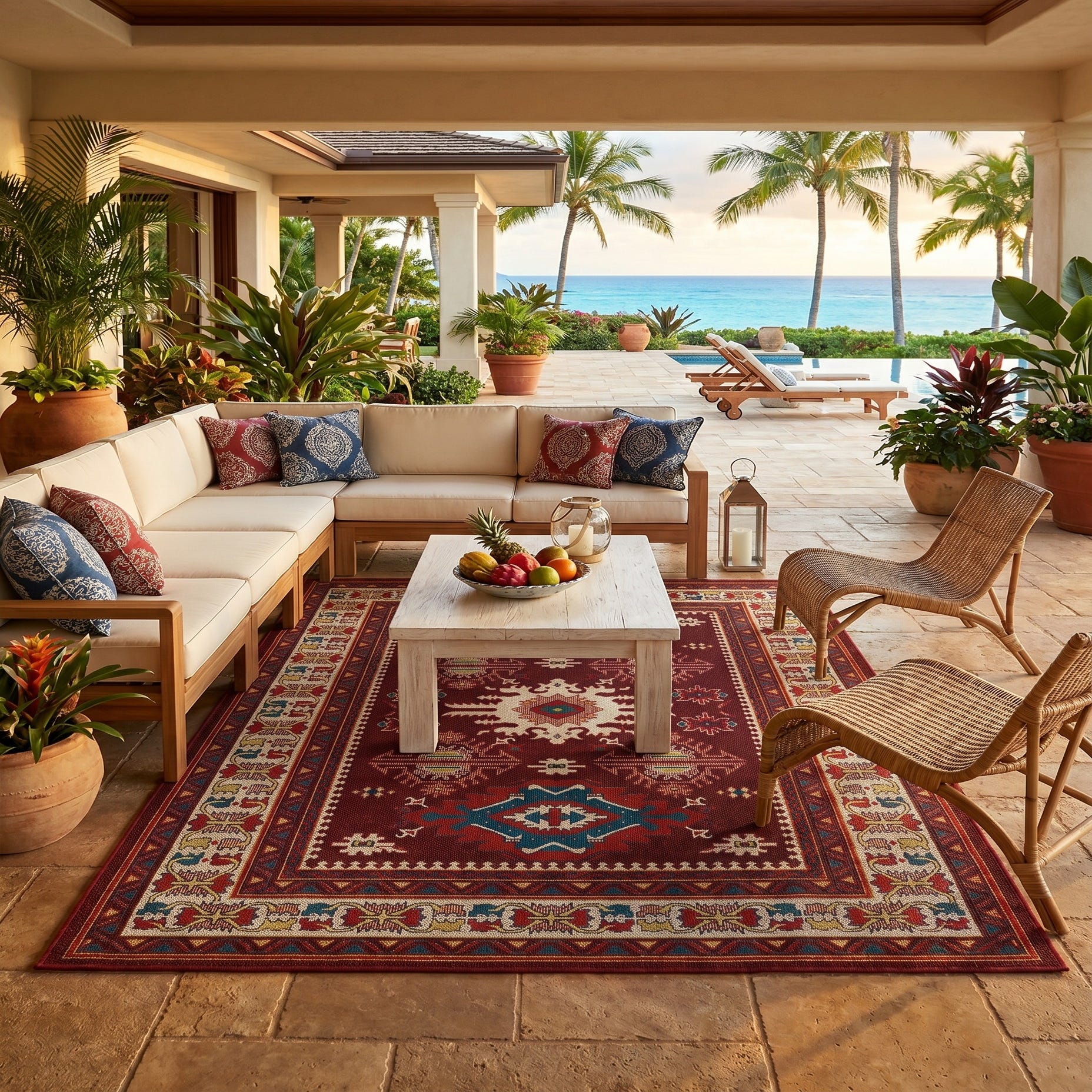 This rug perfectly suits my space and needs. I wanted something durable and colorful. The colors are beautiful; just as pictured! It's made well shipping was quick and the sale price was great. BUT...one problem and it's significant; it came so tightly rolled (inside out) that I have not been able to get it to lay completely flat. Because of the rigid material it's made of (it's an outdoor rug) it's been impossible to handroll it to flatten it. I have laid it out upside down with weights on the ends but even after several weeks the ends still curl up. It's created a tripping hazard. HELP!