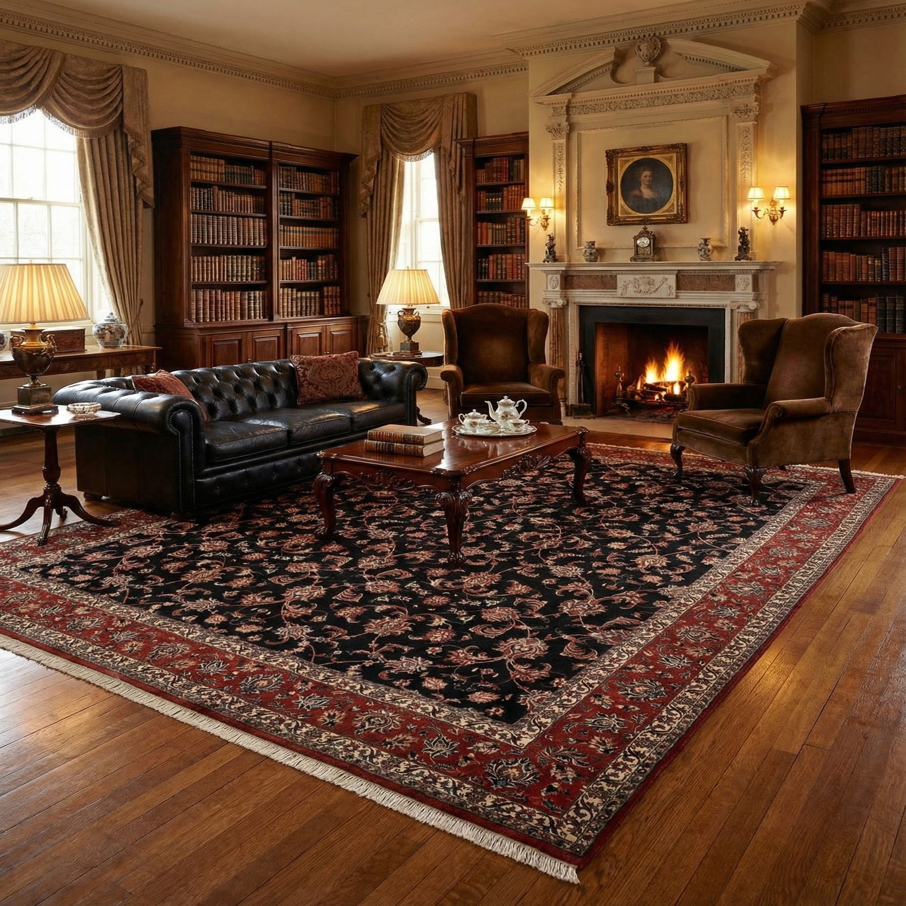 An 8x10 rectangular Persian rug with a deep red border and a black field featuring intricate floral patterns.