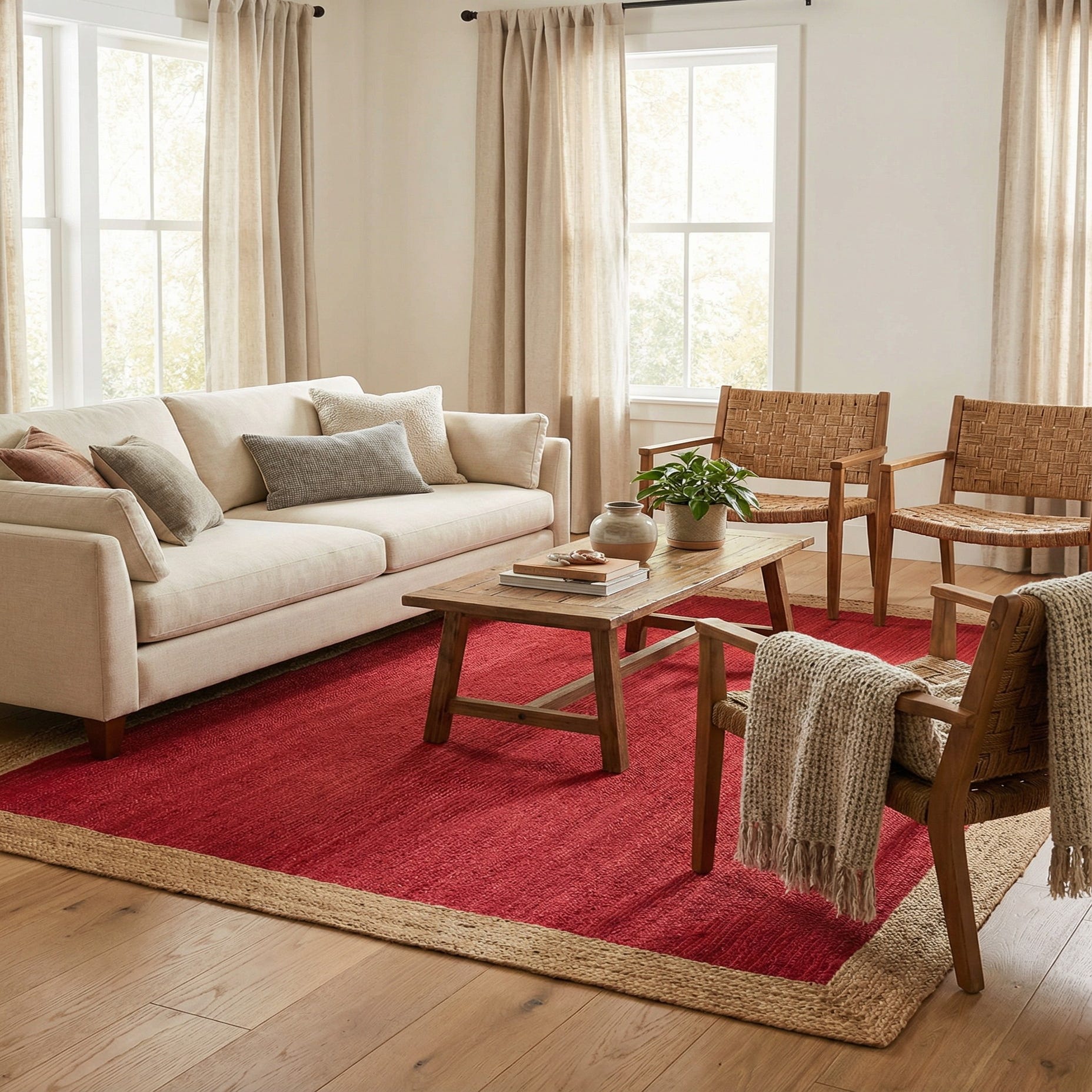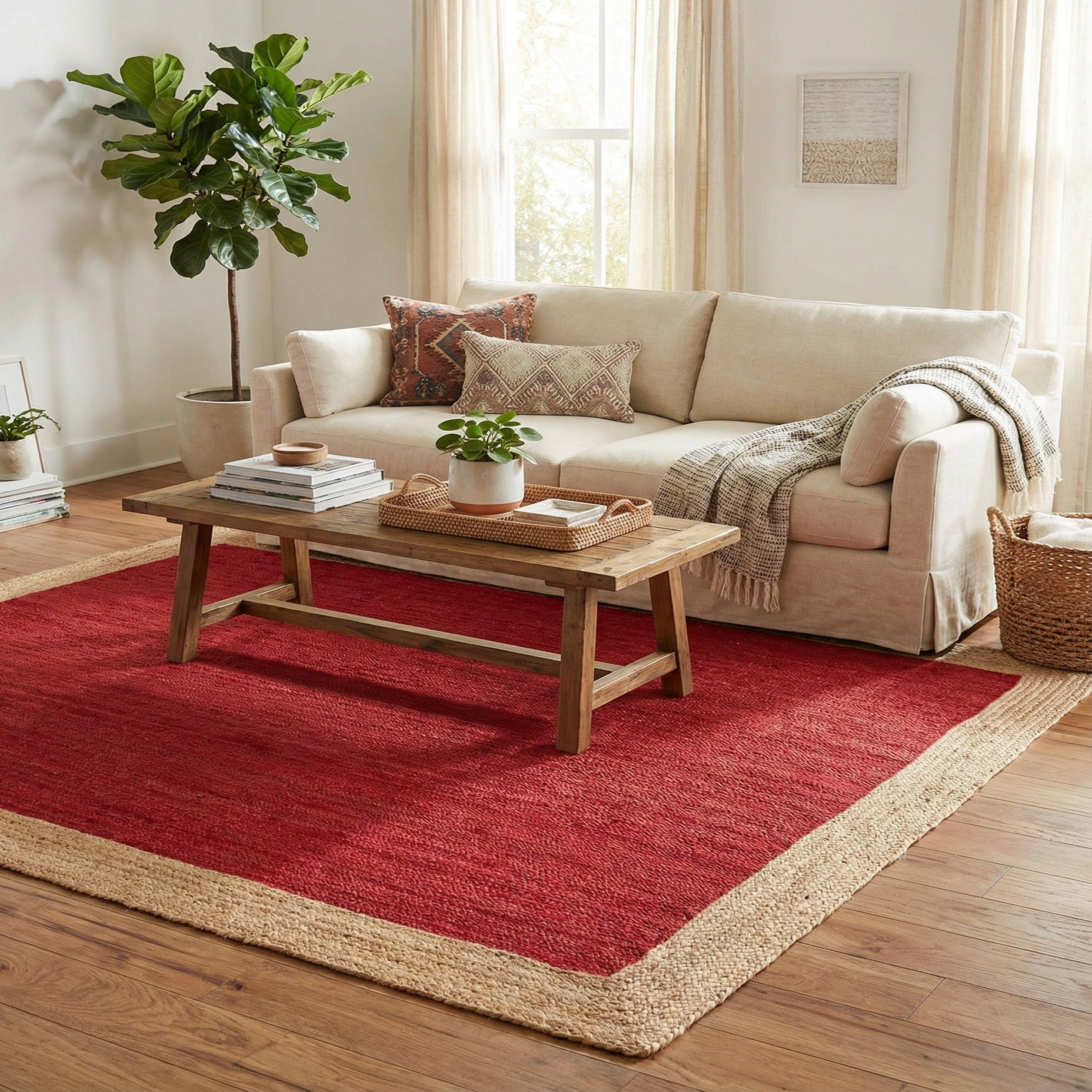 Warm red fills the field of this rug, its color deep and consistent with subtle linear variations that come from the natural jute fibers. A structured, natural-hued braided border frames the center, creating a clean two-tone pattern that balances color with organic texture. The overall style is relaxed and grounded, with a simple, classic look that feels intentional rather than ornate.