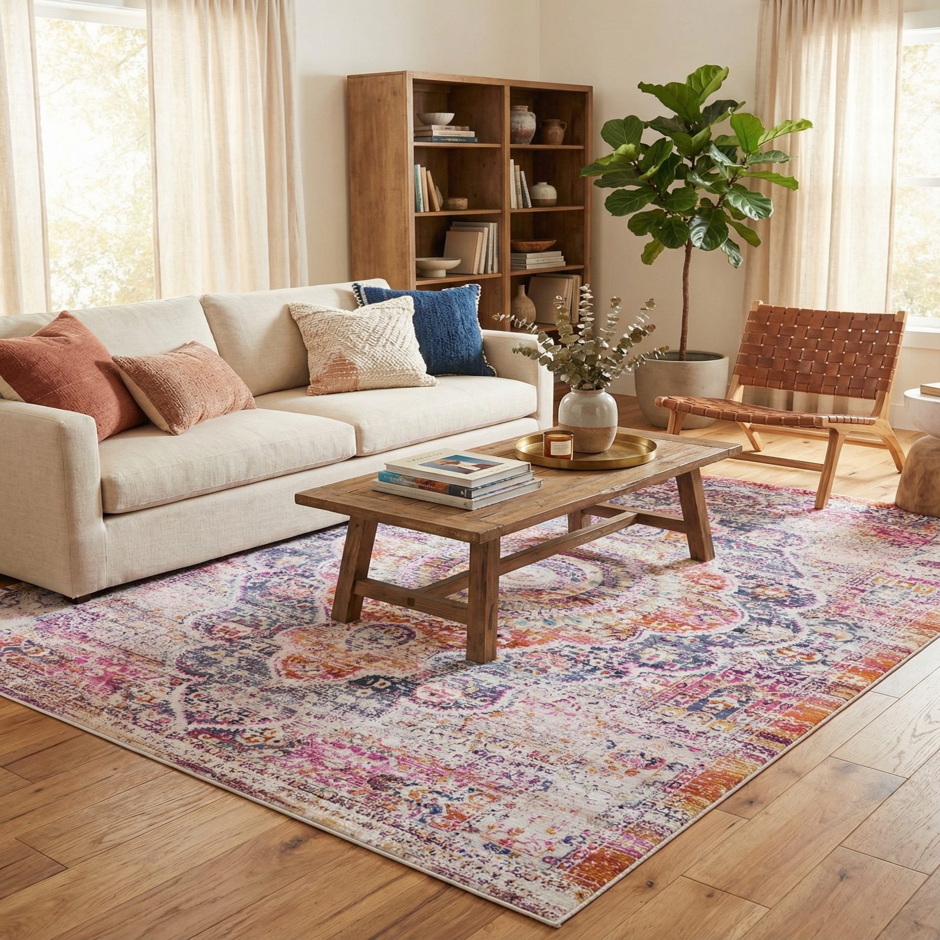 Machine-made from 70% polypropylene and 30% polyester, the rug has a low-profile, slightly plush texture that’s soft underfoot yet lays flat for furniture placement. It works well as the focal point in a living room or under a coffee table, anchors a seating group in a family room, or adds color and pattern to a bedroom. Pair it with warm wood furniture and leather accents for a classic transitional feel, use layered textiles and plants for a relaxed bohemian look, or set it against neutral upholstery to introduce vibrant contrast in a contemporary space.