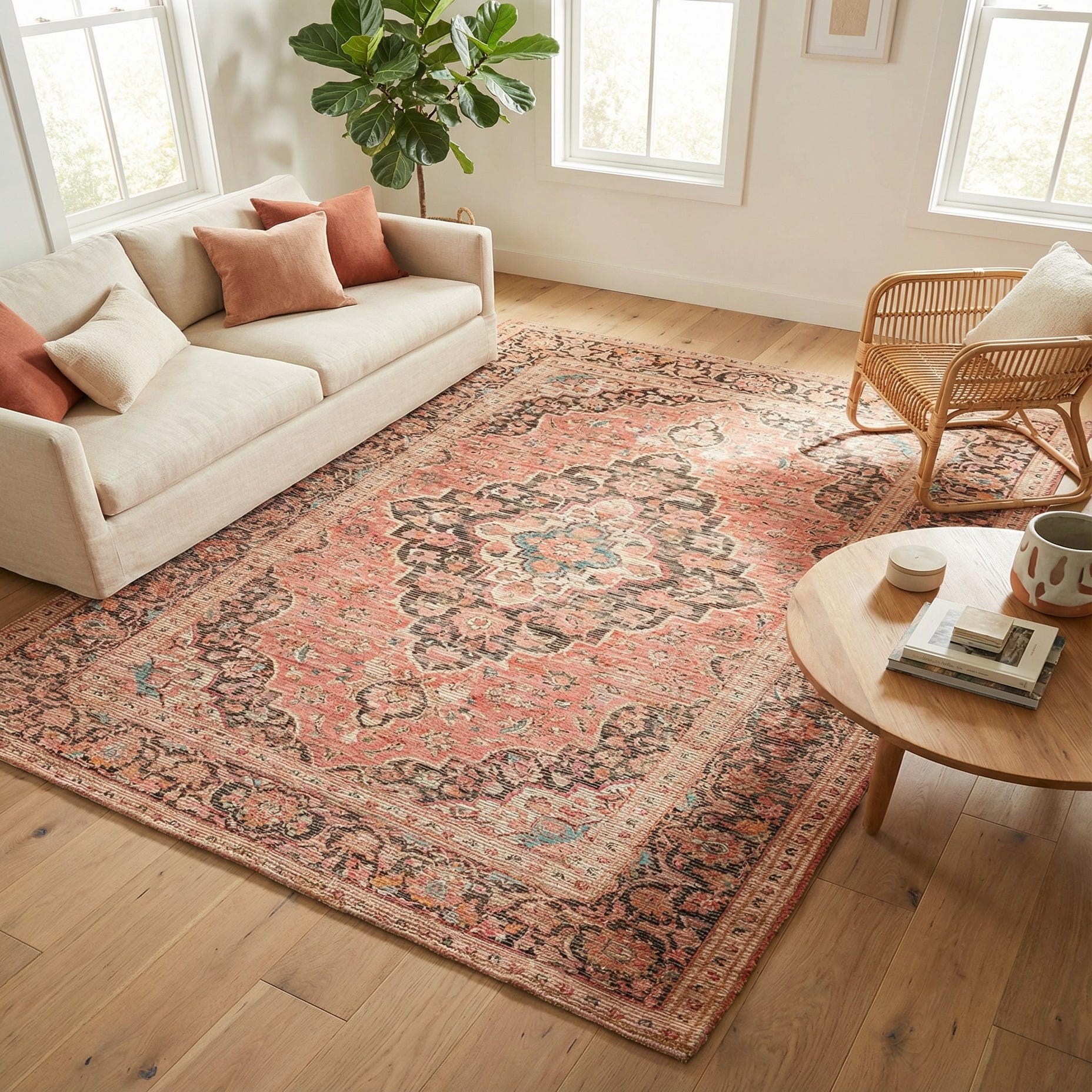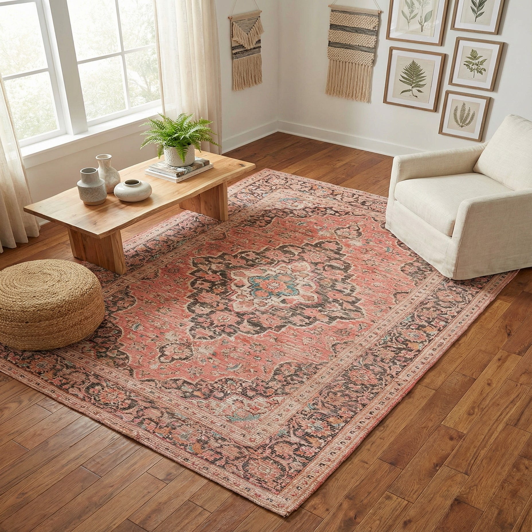 This rug will ground a seating area beneath a coffee table or add color and pattern to a bedroom at the foot of the bed. Pair it with warm wood tones, leather upholstery, and woven accessories for a layered, comfortable living room; set it in a bohemian or eclectic scheme with mixed textiles and plants to highlight the pink and blue accents; or use it to warm a neutral, modern space where the red field becomes the room’s focal point.