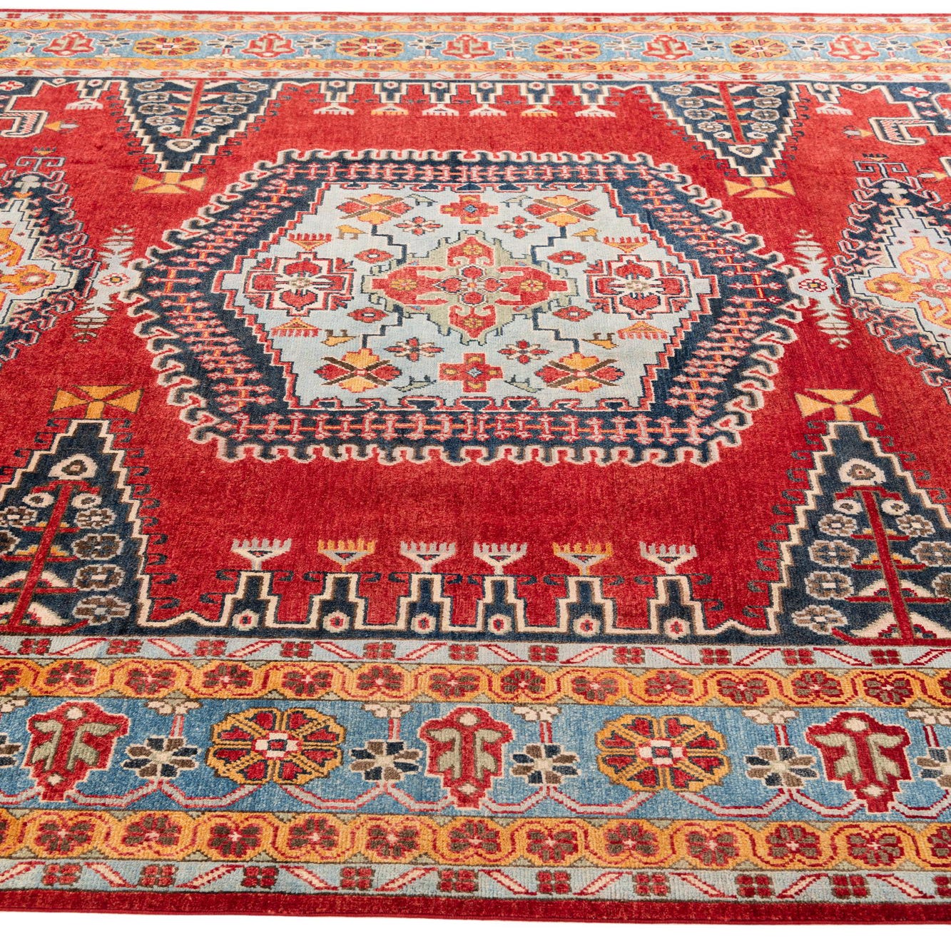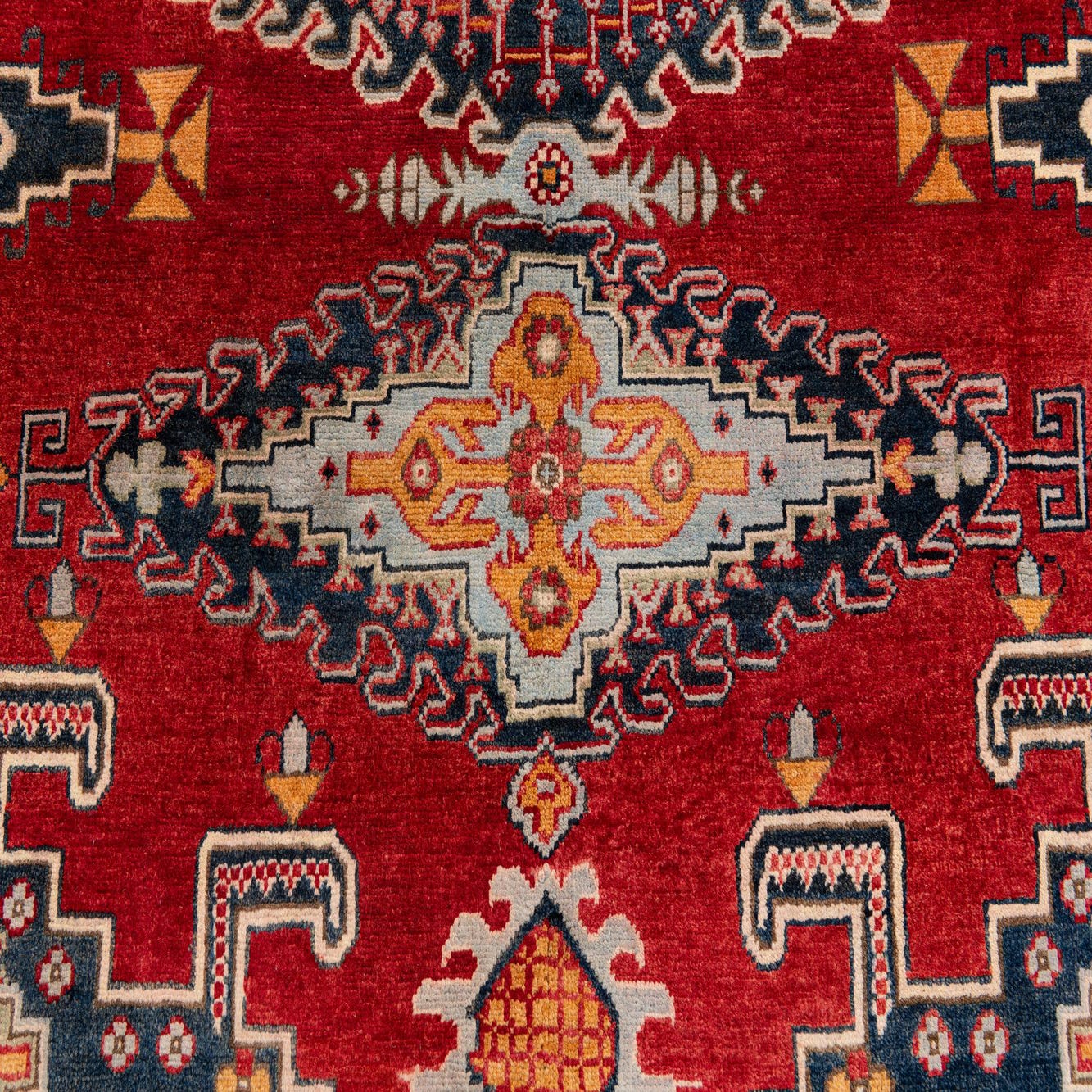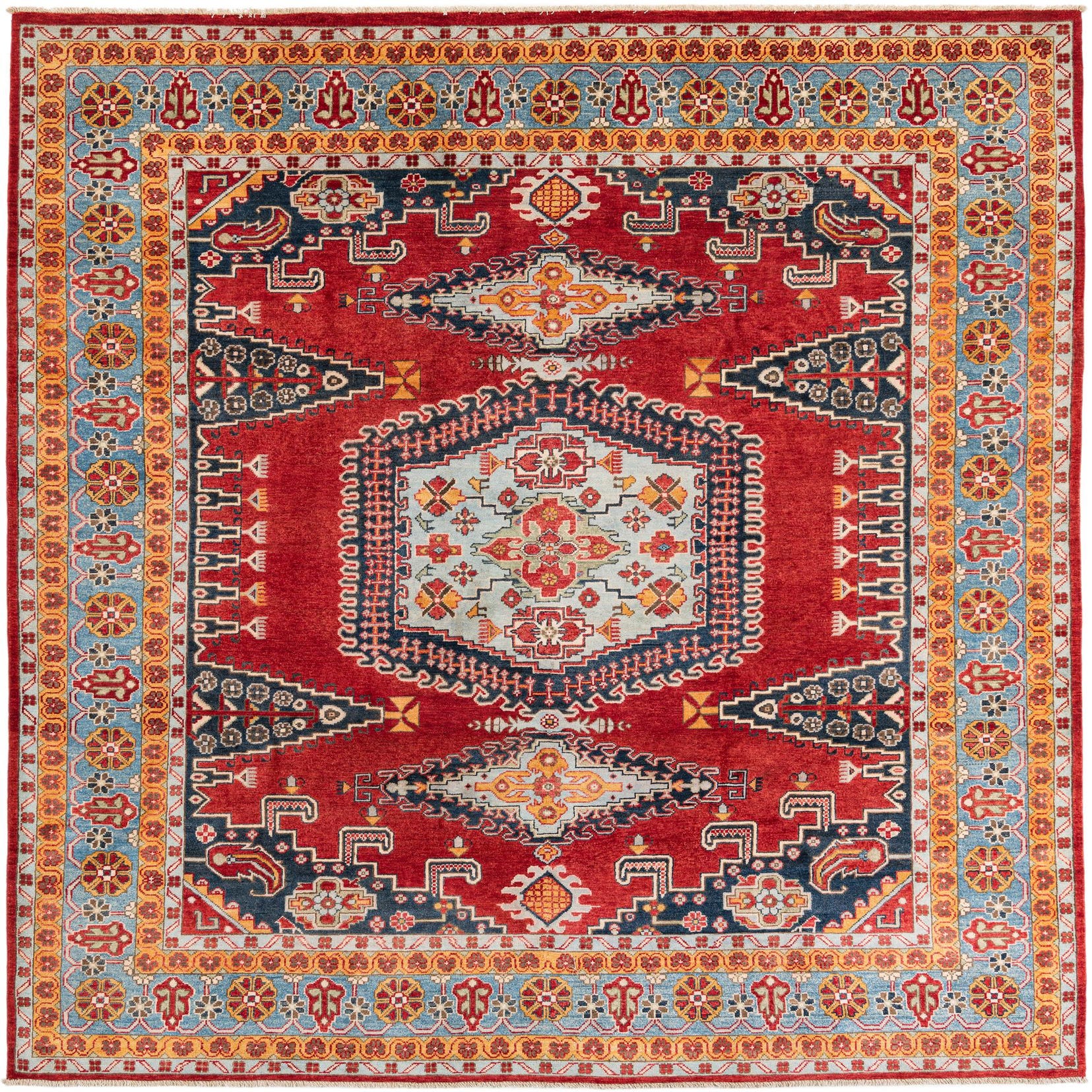 An 8x10 rectangular Kazak rug with a vibrant red field, featuring a central medallion and intricate geometric patterns in shades of blue, gold, and cream.