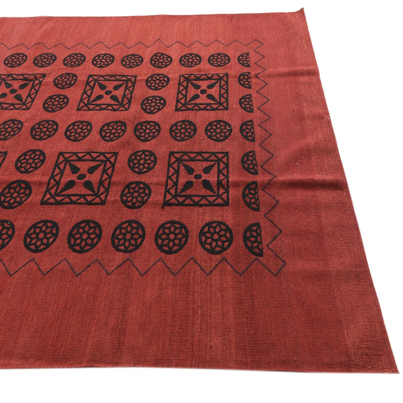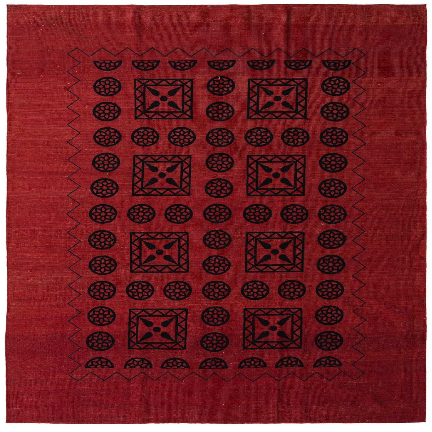 Primary color is Red. Colors in this rug include: Red, Black.