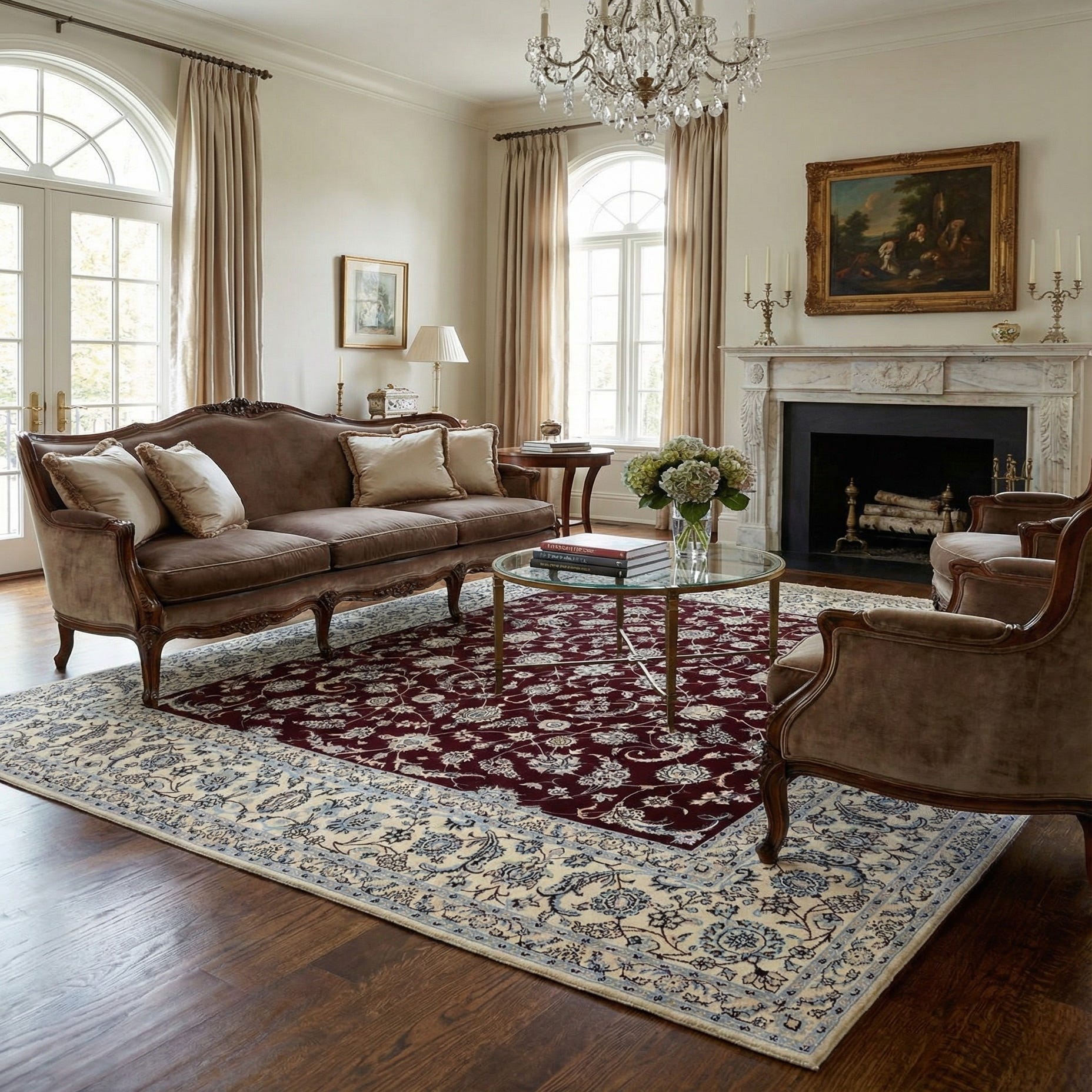 An 8x10 rectangular Persian rug featuring a deep red field with intricate floral patterns in light blue and cream, bordered by a wide cream frame with complementary designs.