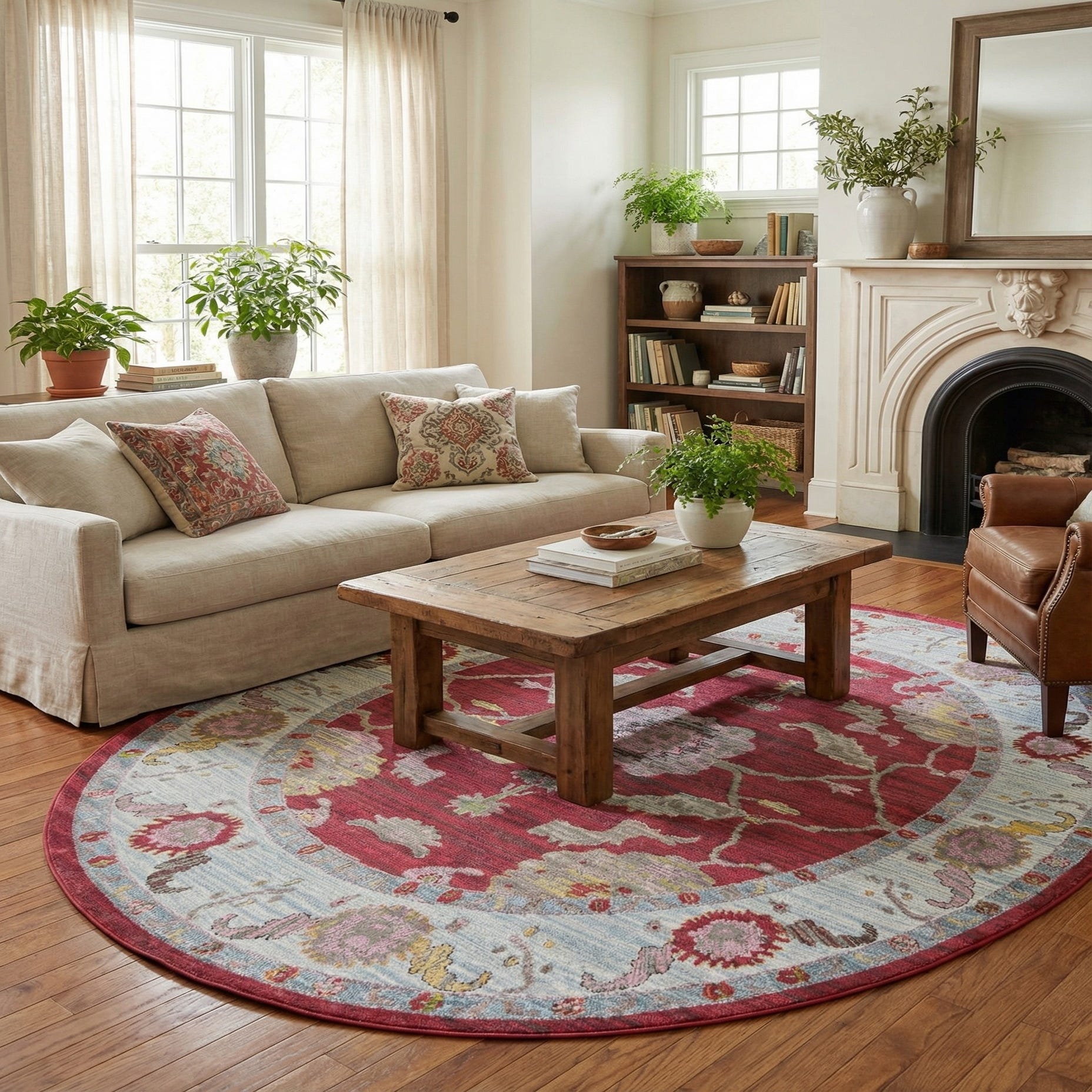 The oval shape makes this piece a natural choice for rounded tables, an entry or seating area, or layered over a larger neutral rug to define a conversation nook. It suits transitional and traditional interiors—pair it with warm wood tones, blue-gray upholstery, soft linens, and brass or matte-black accents to balance the vibrant red and the pastel highlights. The palette and pattern bring a warm, composed focal point to living rooms, bedrooms, or sunrooms.