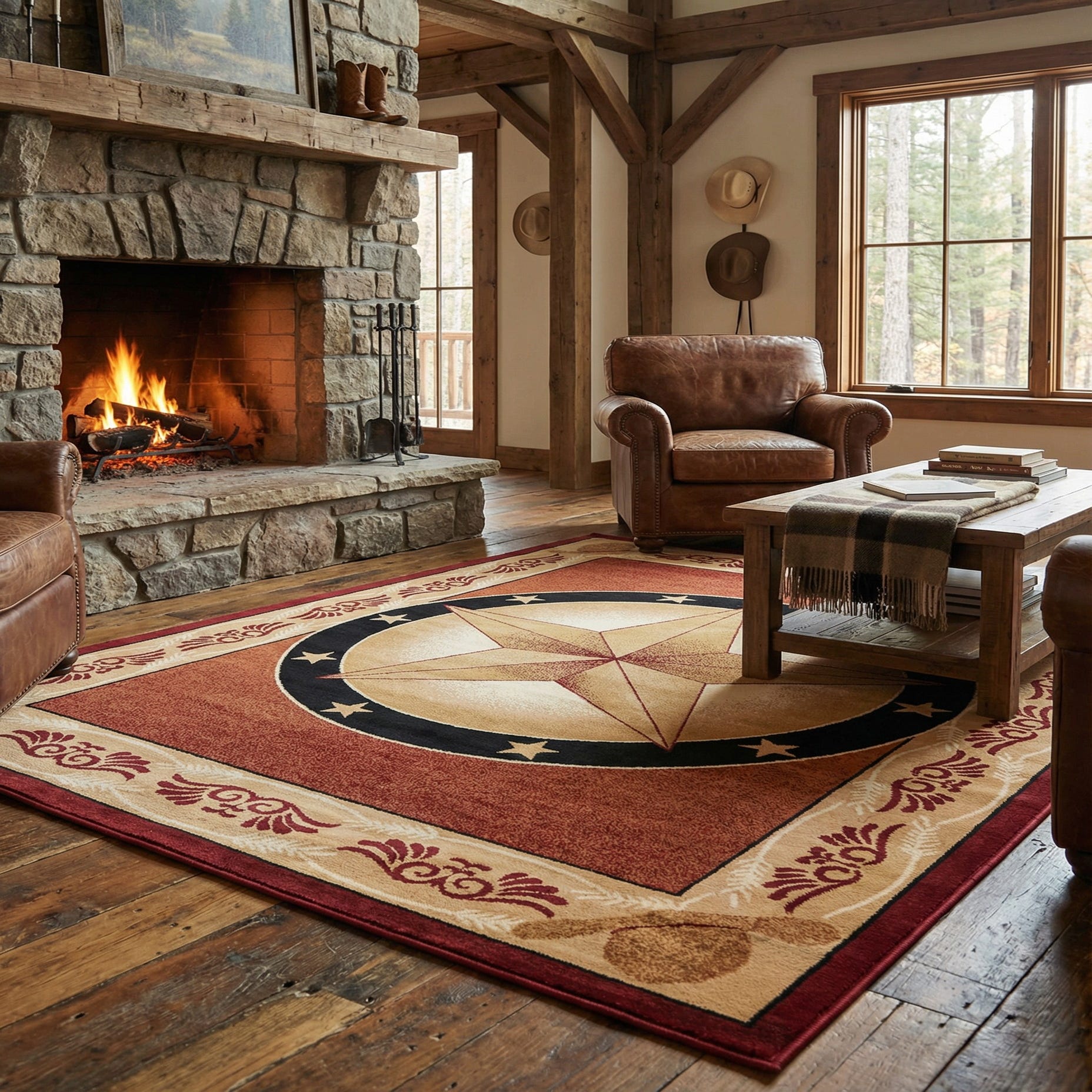 A bold five-point star anchors the design, rendered in warm beige and brown tones with subtle shading that gives the motif dimensional presence. That central star sits inside a black circular band dotted with ivory stars, set against a rich red field with a finely speckled brown texture. A cream-beige border frames the composition, accented with red foliate scrolls, wheat-like motifs and corner illustrations of a straw hat and lariat, giving the rug a distinct Western-inspired, Americana character. The color palette of red, beige, black, brown and ivory layers warmth and contrast for a grounded, country aesthetic.