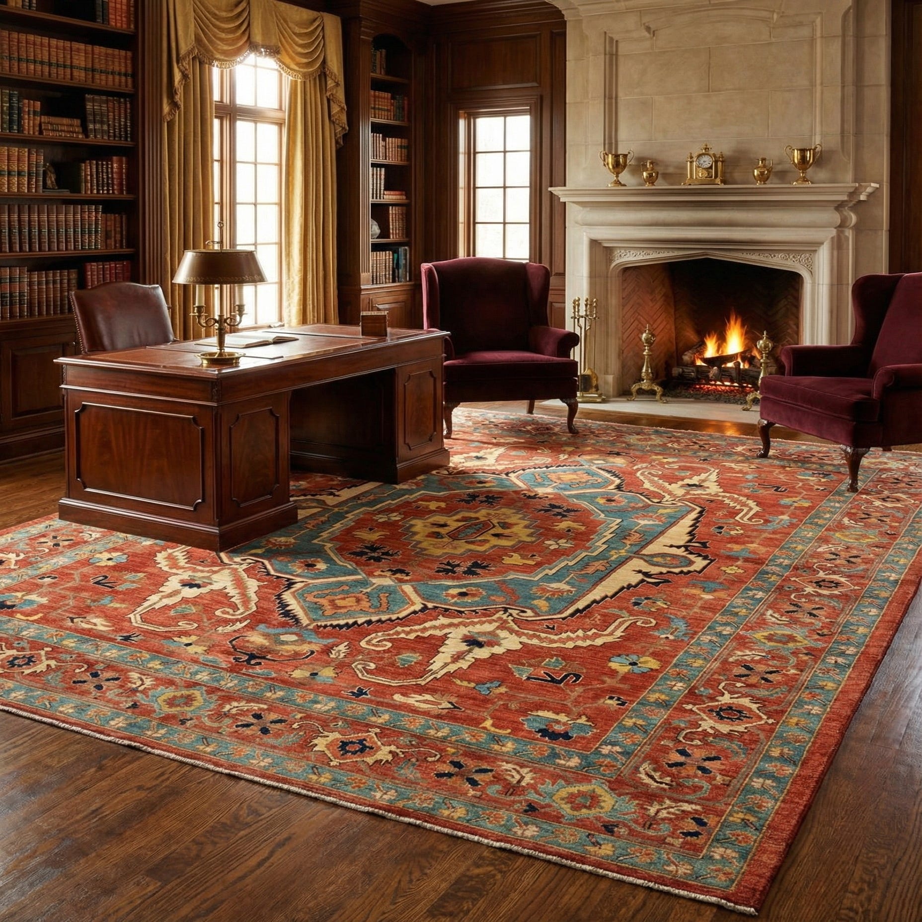 An 8x10 rectangular Sara Persian rug in rich red with intricate teal, gold, and cream traditional patterns, ideal for a living room.