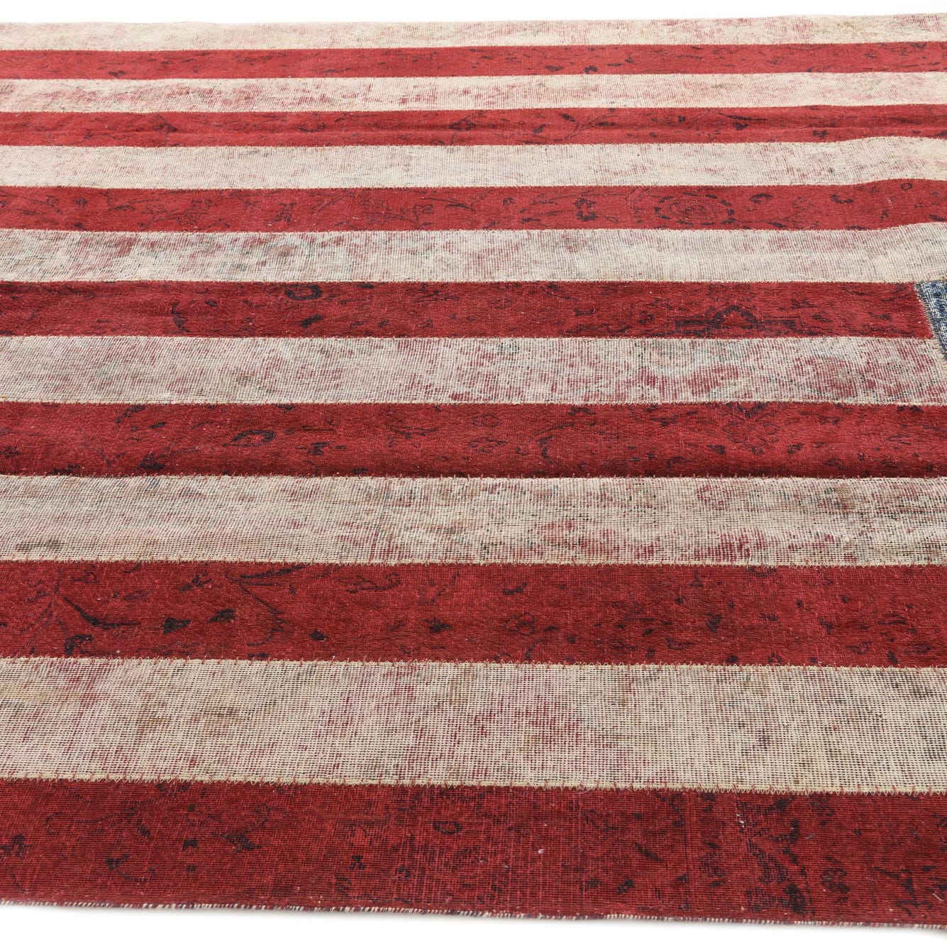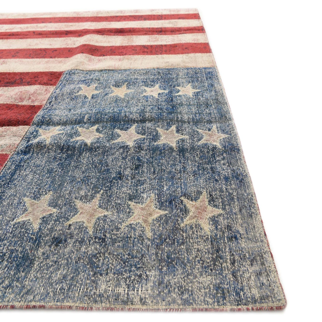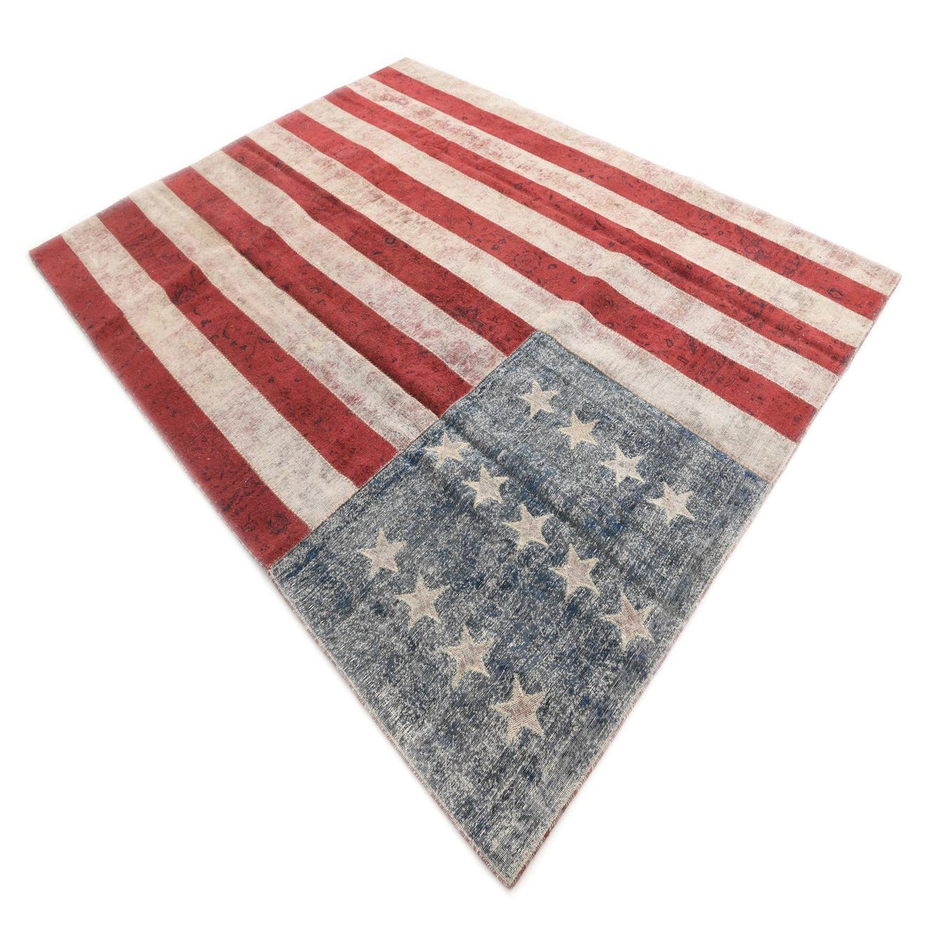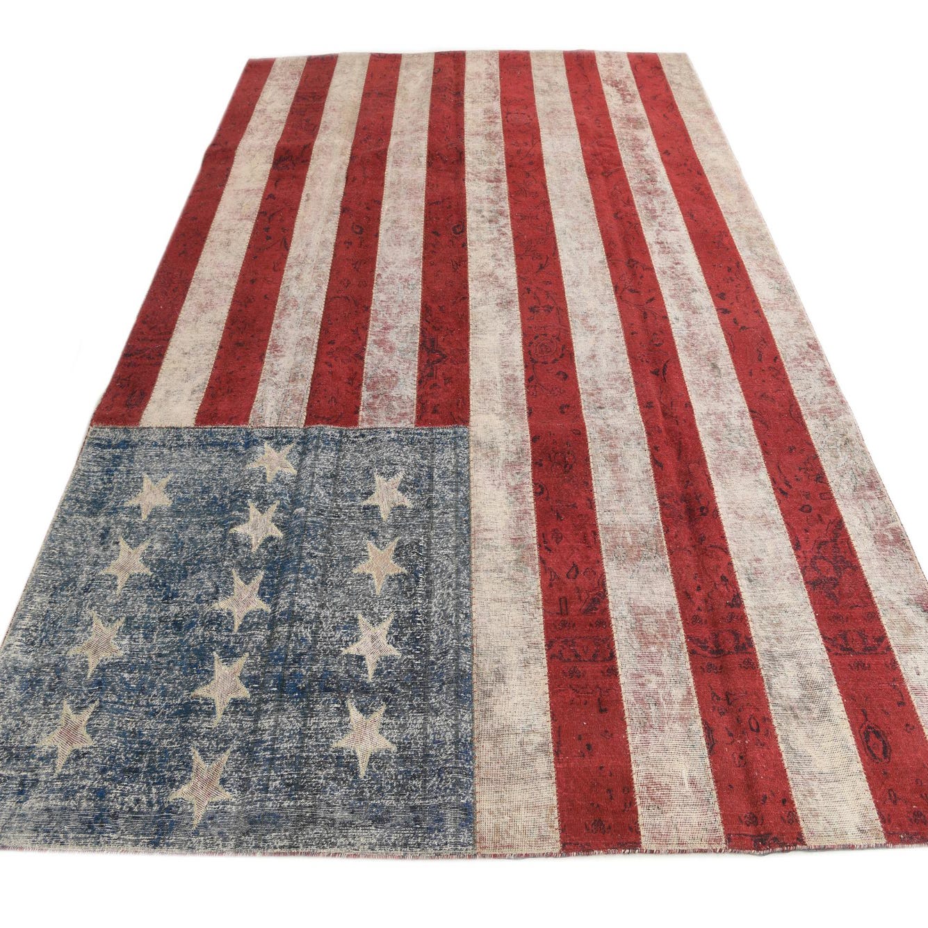The Ultra Vintage collection presents a distinguished 8x10 hand-knotted rug, crafted of 100% wool, which brings both enduring quality and timeless design to your floor. The rug features a bold rendition of the American flag with a background color of red, complemented by stripes in beige and rich browns, alongside a field of blue with a constellation of stars. The rug is characterized by a weathered appearance, which infuses it with a sense of heritage and an established look.
