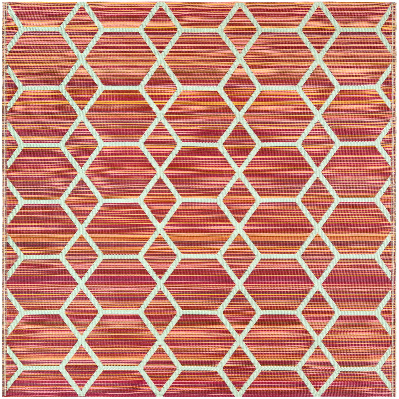 8x10 rectangular red modern rug with a light green geometric honeycomb pattern, suitable for indoor/outdoor use.