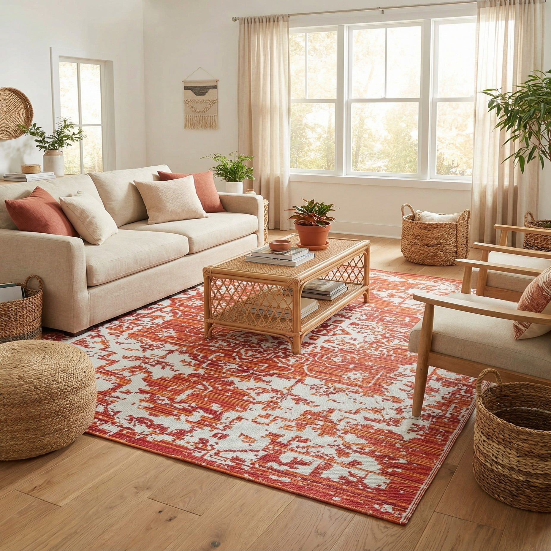 Place this rug on a covered patio or sunroom to introduce a warm focal point, or use it inside to warm a contemporary living room or dining area. It pairs nicely with natural rattan and light wood furnishings, neutral linen upholstery, or navy accents for contrast, and lays flat under dining chairs or outdoor seating to integrate with both casual and transitional design schemes.