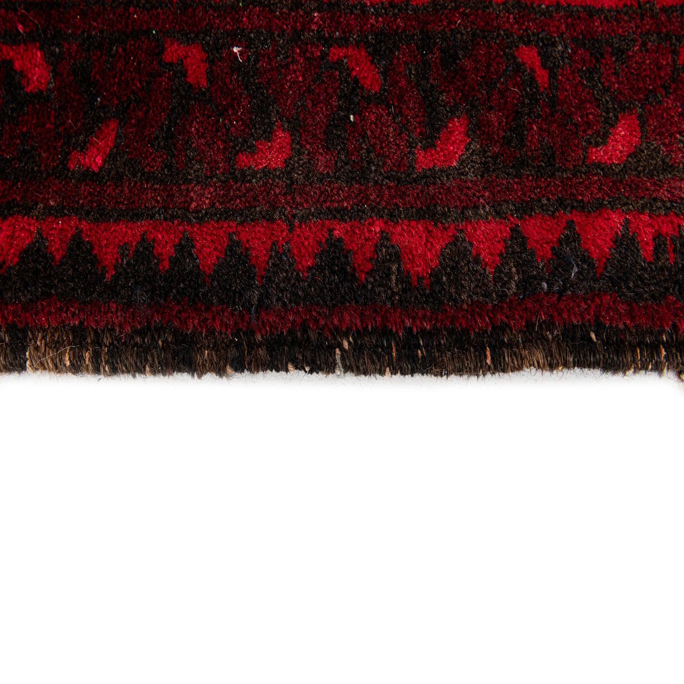 An 8x11 rectangular red tribal rug with a dark red border and geometric patterns, ideal for a living room.