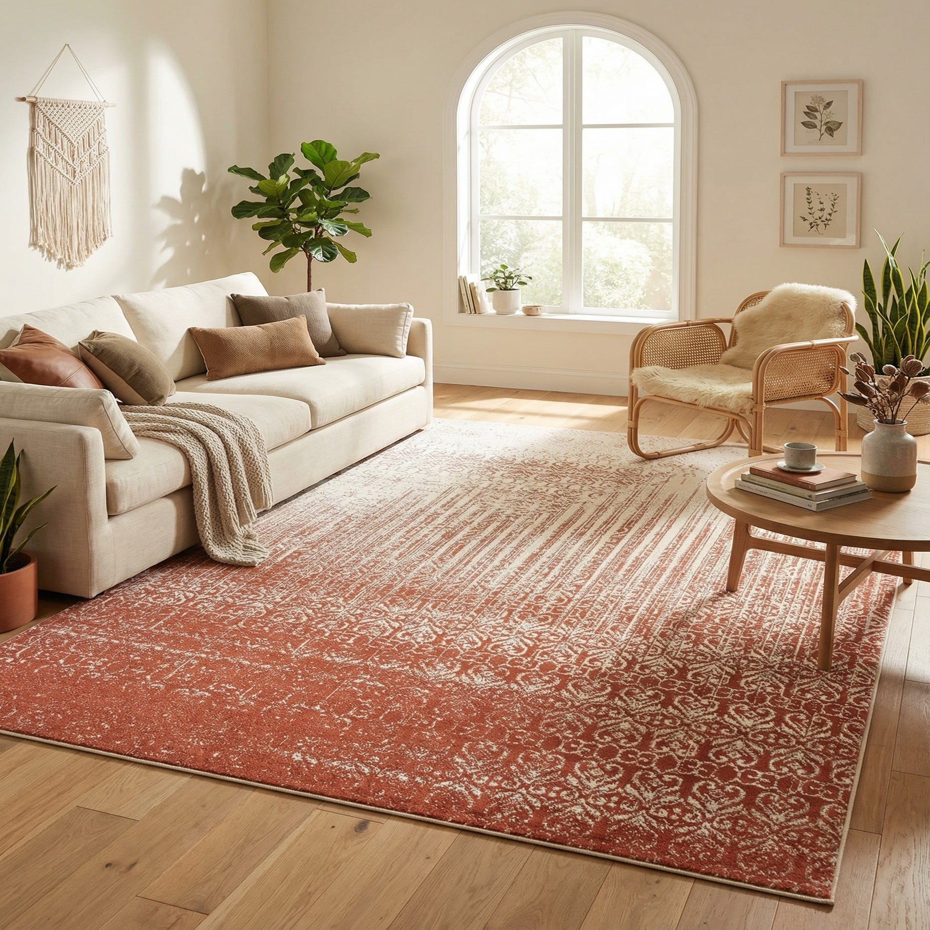 Primary color is Red. Colors in this rug include: Red, Beige, Terracotta, Light Brown.