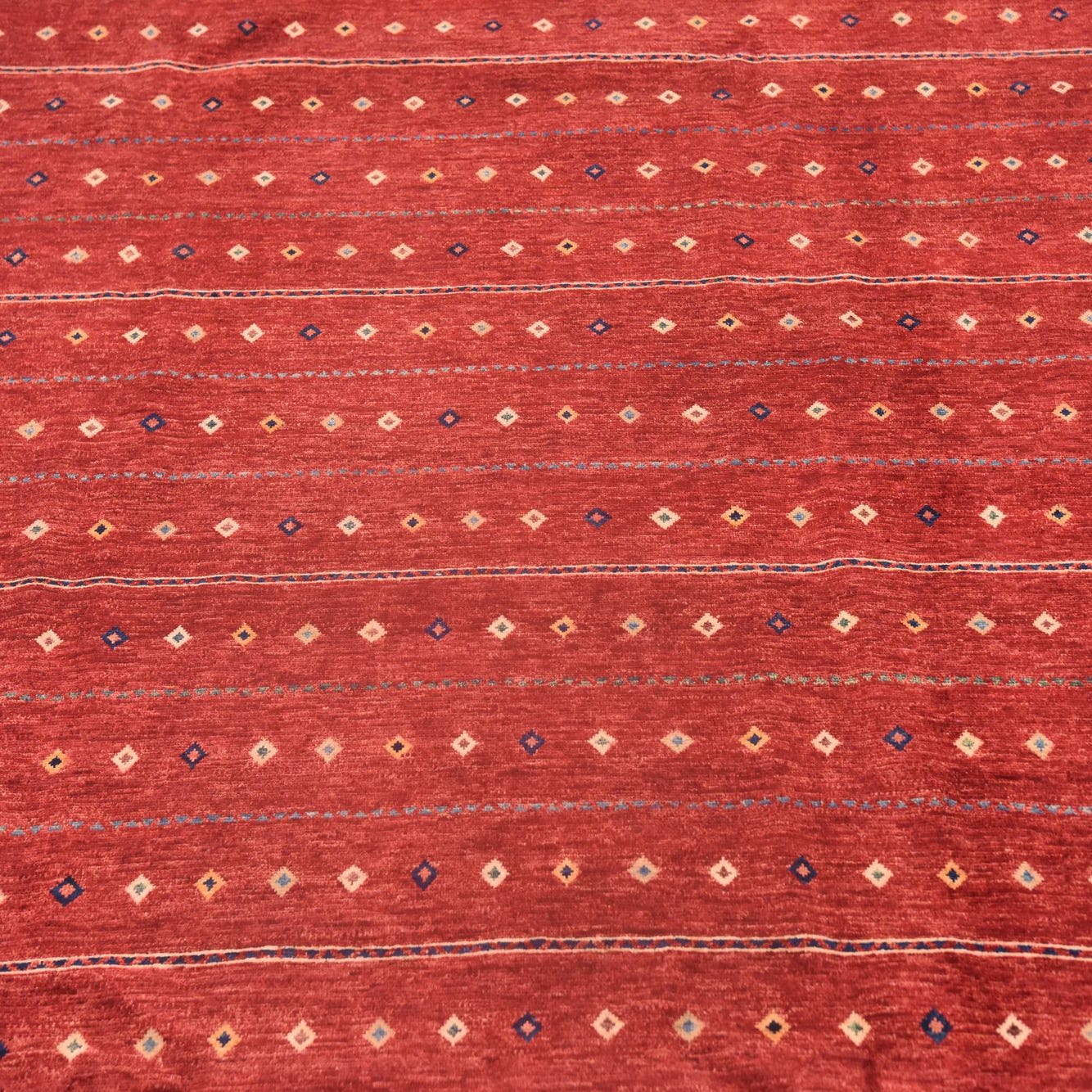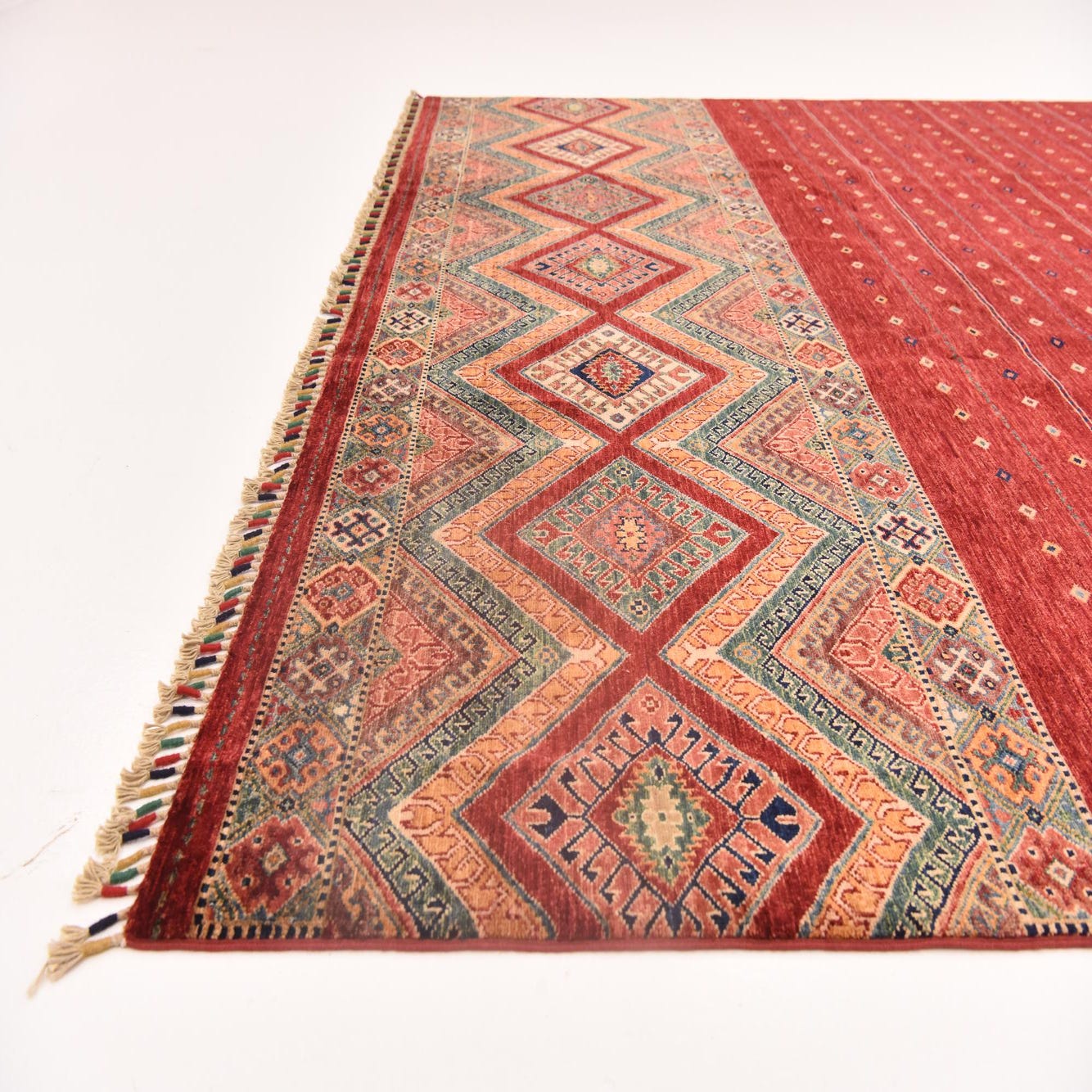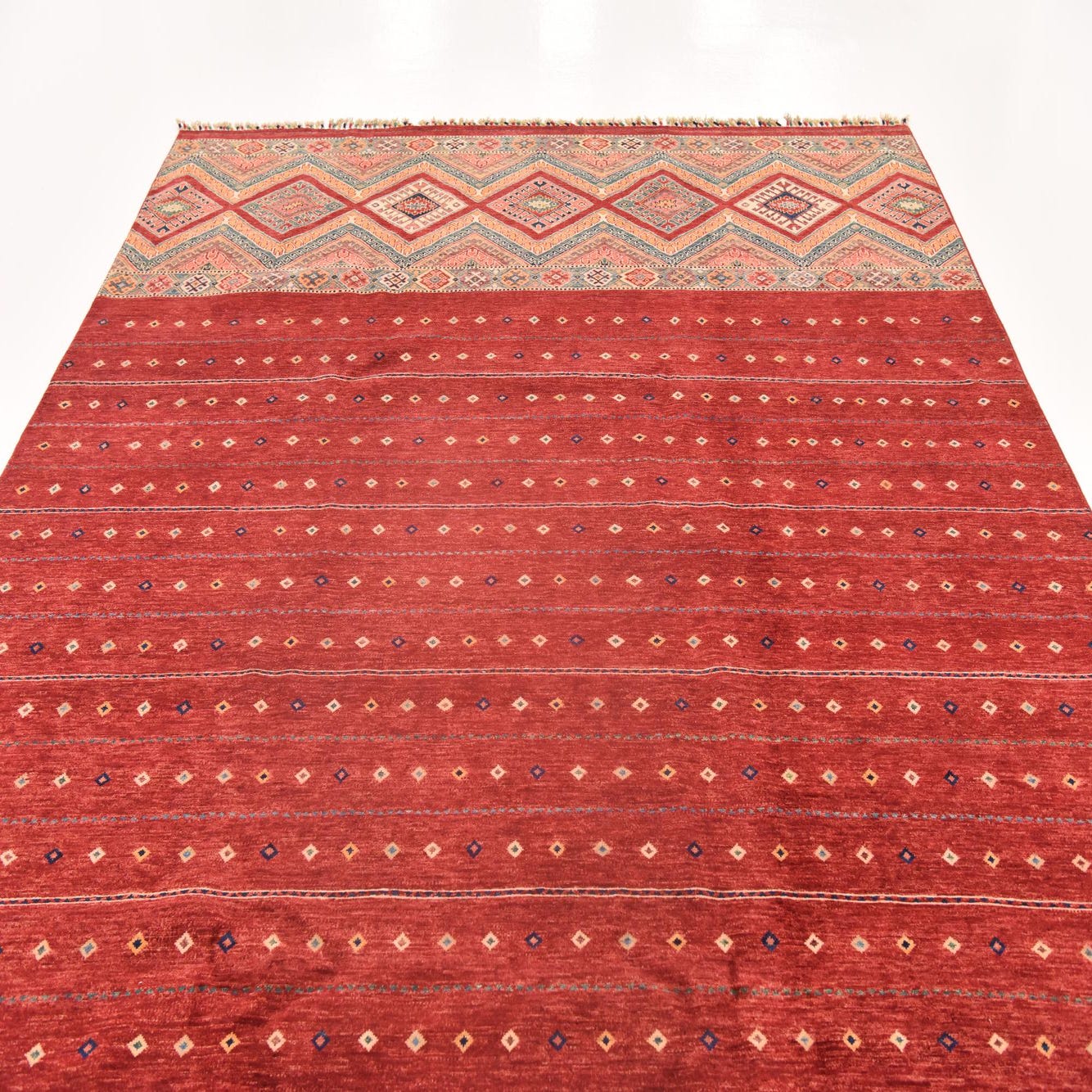 A rectangular 8x11 Ariana Ziegler rug features a rich red field with subtle horizontal stripes and small diamond patterns, bordered by tribal geometric designs in warm earth tones and blues.
