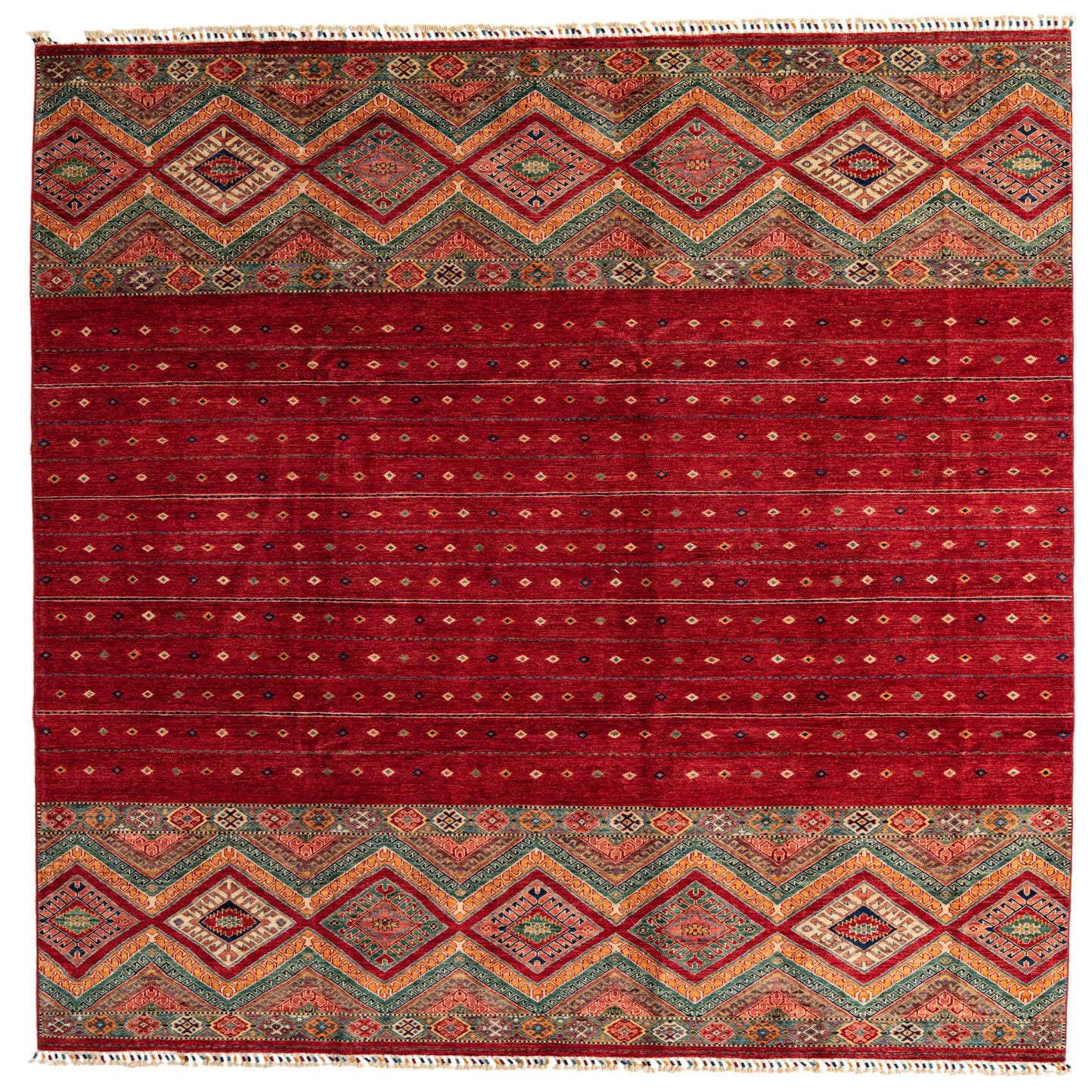 A vibrant 8x11 rectangular Ariana Ziegler rug featuring a rich red field with subtle striped patterns and intricate multi-colored geometric borders.