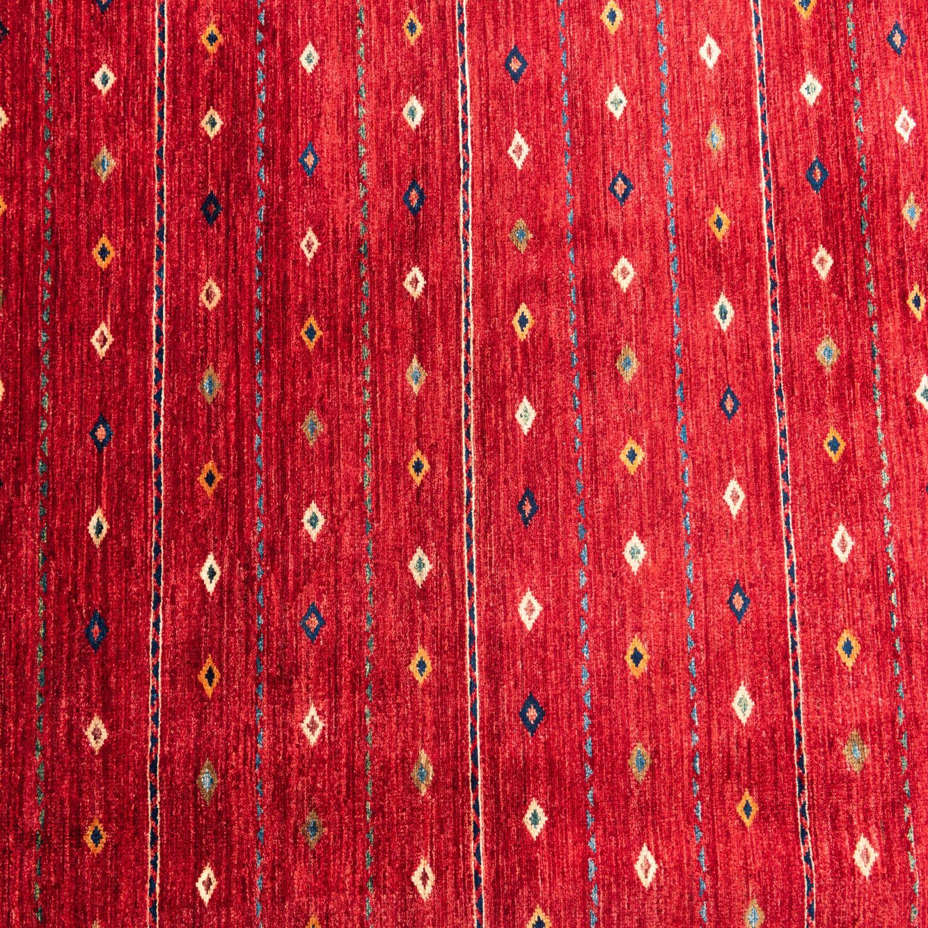 Hand-knotted in 100% hand-spun wool, this rug pairs a rich red field with a banded geometric border for a look rooted in traditional tribal weaving. The central area is punctuated by evenly spaced small diamond motifs in beige, blue, navy, gold, yellow and orange, while the top and bottom borders present larger diamond medallions and chevron rows in peach, green, brown and gold. The hand-spun wool gives the surface a warm, tactile quality—soft underfoot with a slightly springy feel and subtle variations in texture and color that come from hand-knotting and natural dyes. Finished ends with short fringe frame the design and reinforce its handcrafted character.