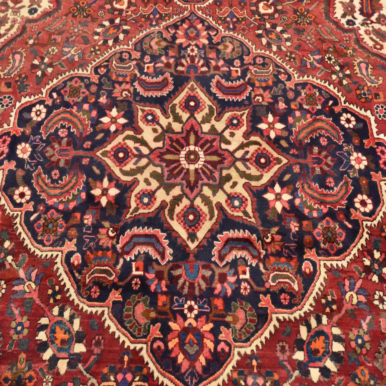 Primary color is Red. Colors in this rug include: Red, Beige, Black, Blue, Brown, Ivory, Navy Blue, Olive, Green, Orange.