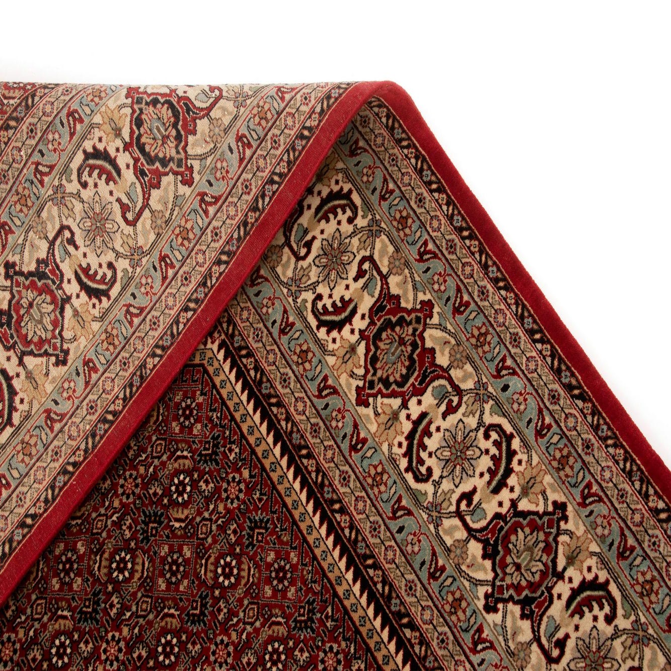 An 8x11 rectangular Bidjar wool rug with a traditional red and beige medallion pattern, featuring intricate floral motifs and a detailed border.