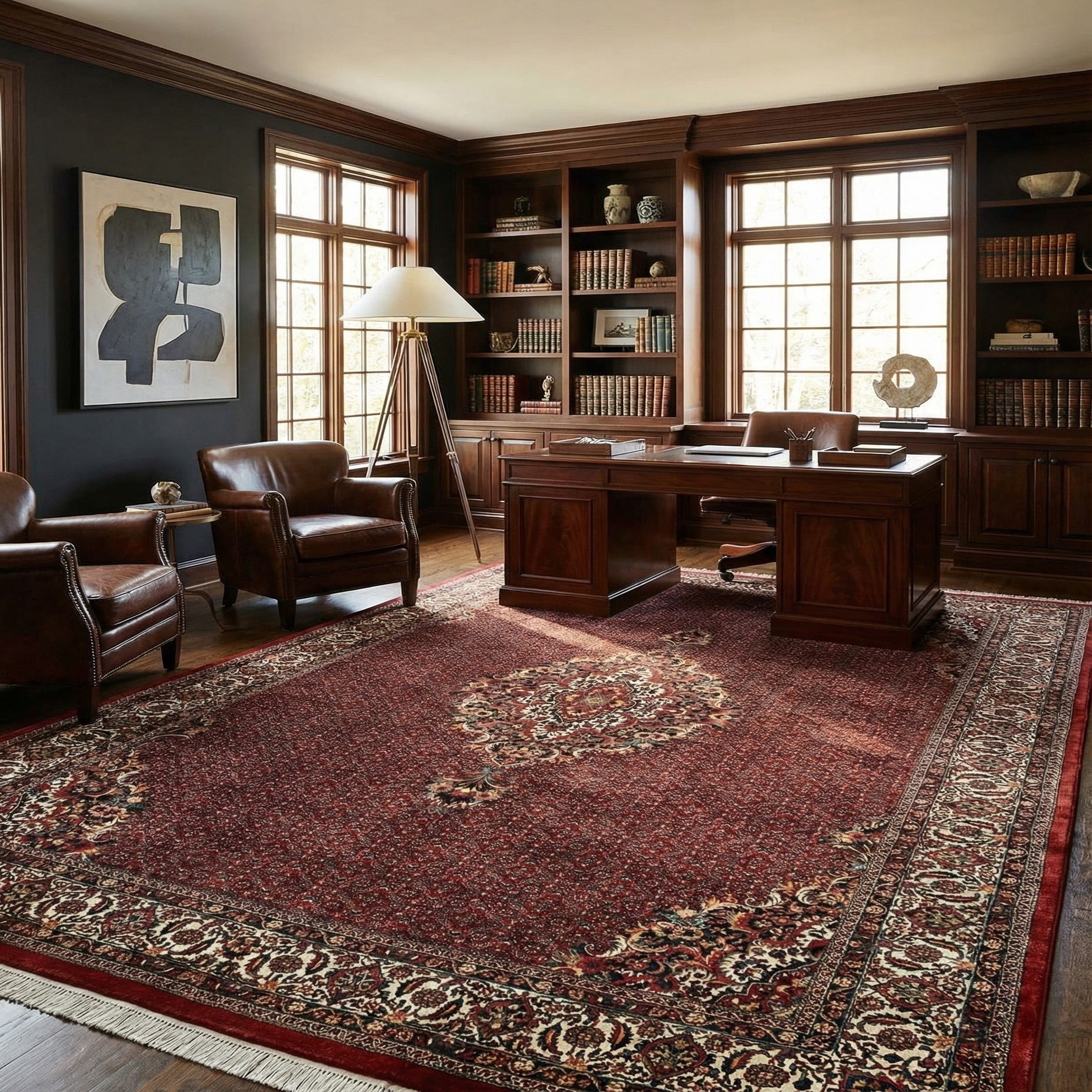 A luxurious 8x11 rectangular Bidjar With Silk rug in deep red, featuring an intricate Persian medallion and floral border.