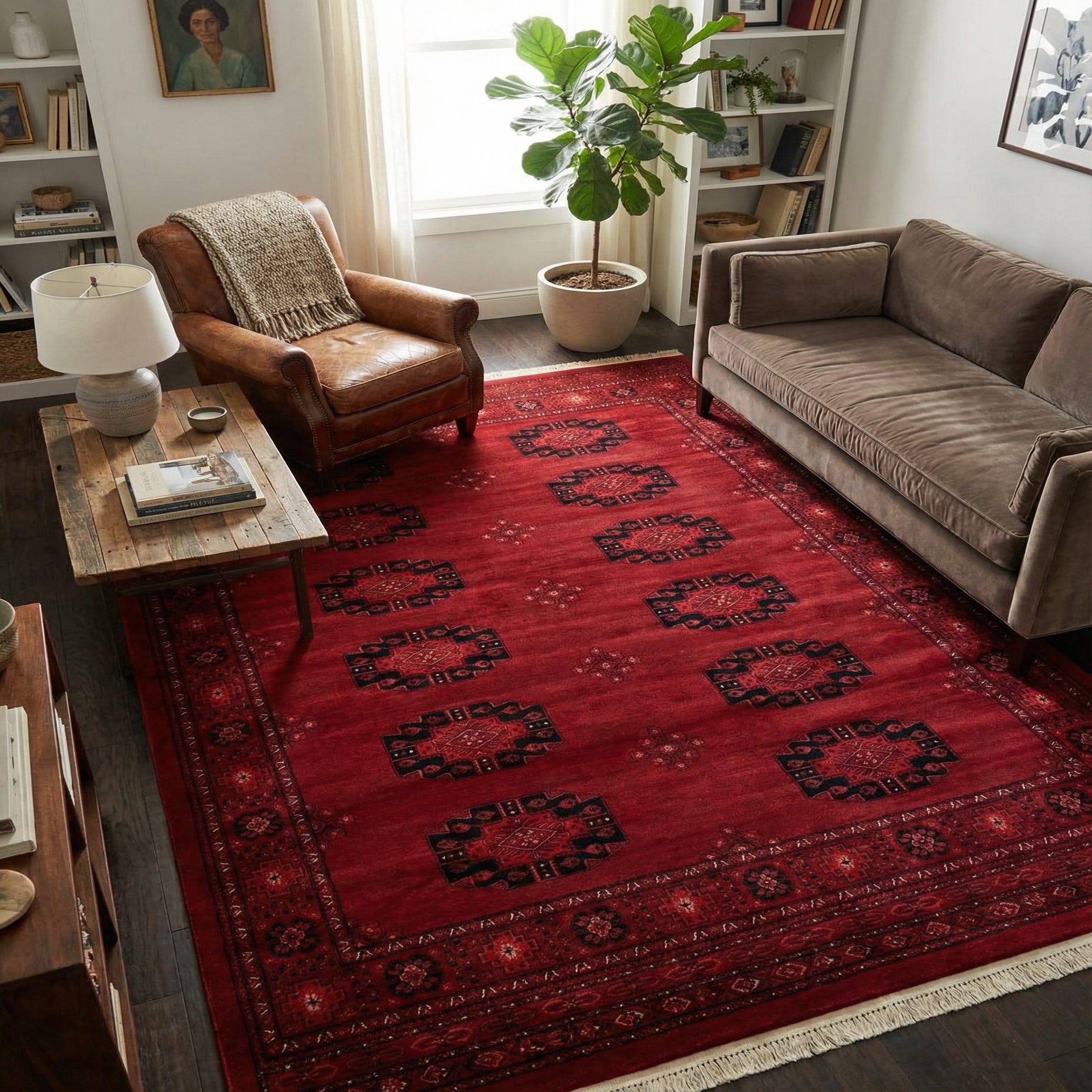 A deep red field sets a warm, confident stage for a traditional repeating gul motif arranged in crisp, evenly spaced rows. Octagonal medallions in black and terracotta contrast against the red, while small cream and terracotta floral accents punctuate the spaces between. A stepped inner border and a broader outer band carry complementary geometric florals in black, cream and terracotta, giving the rug a structured, classic look that reads as both formal and inviting.