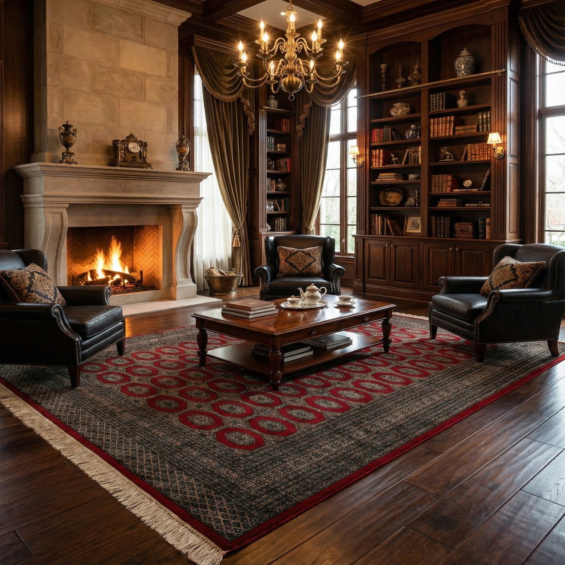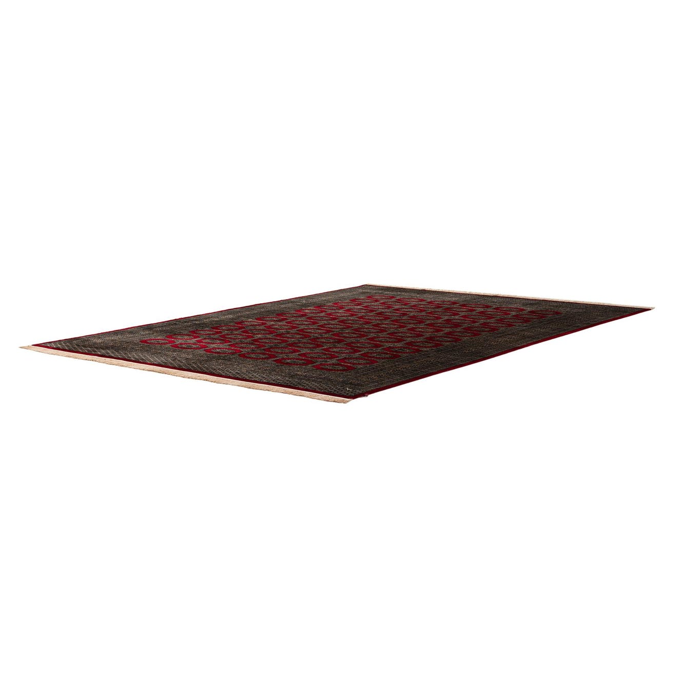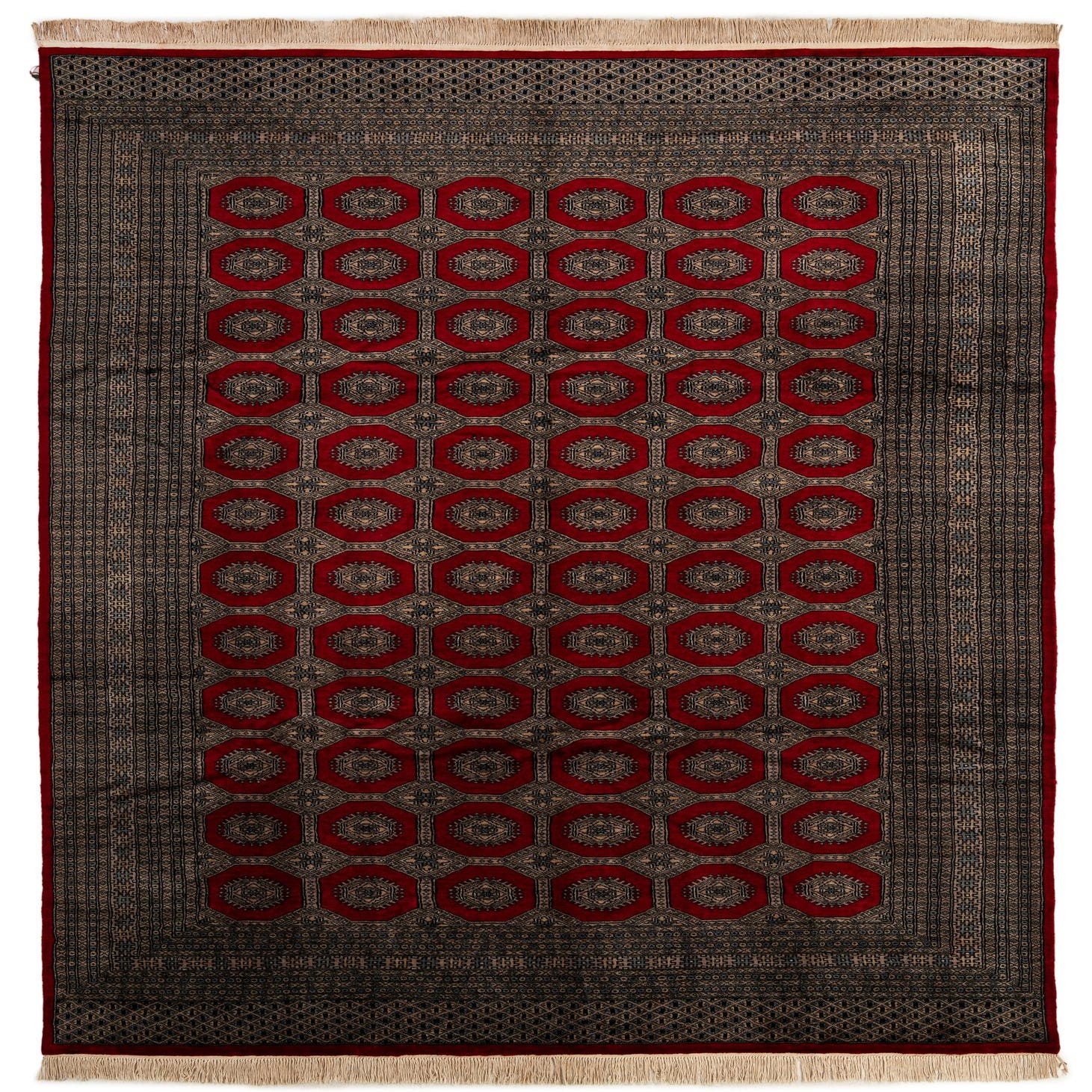 A rectangular 8x11 red tribal Bokhara wool rug with a repeating octagonal pattern and intricate border.