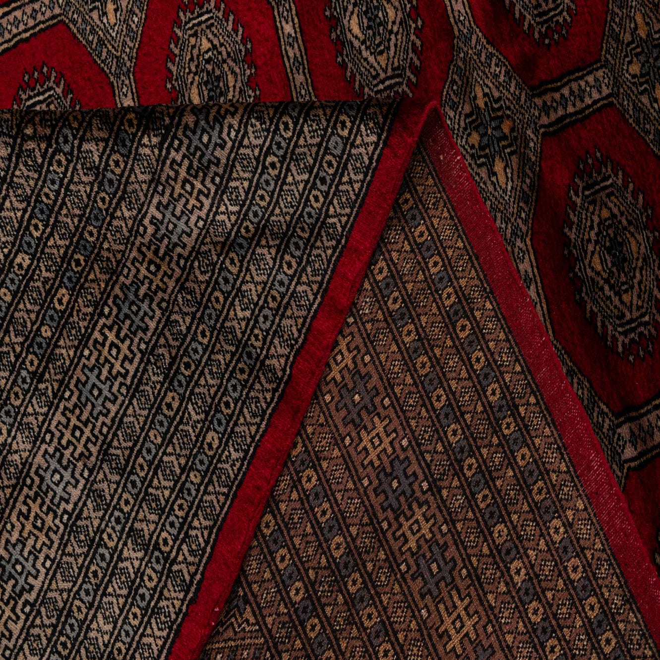 Primary color is Red. Colors in this rug include: Red, Brown, Black, Beige.