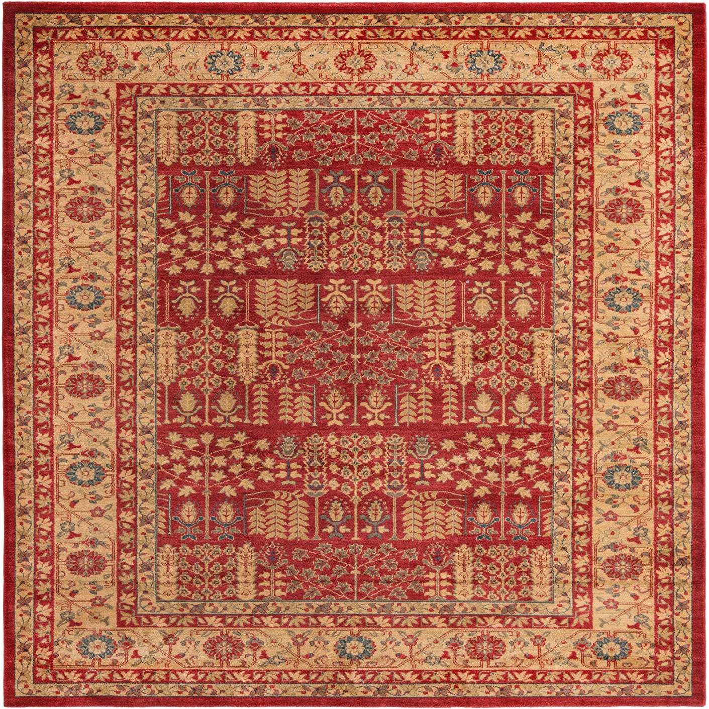 Primary color is Red. Colors in this rug include: Red, Beige, Blue, Brown, Light Blue, Light Brown, Light Green.