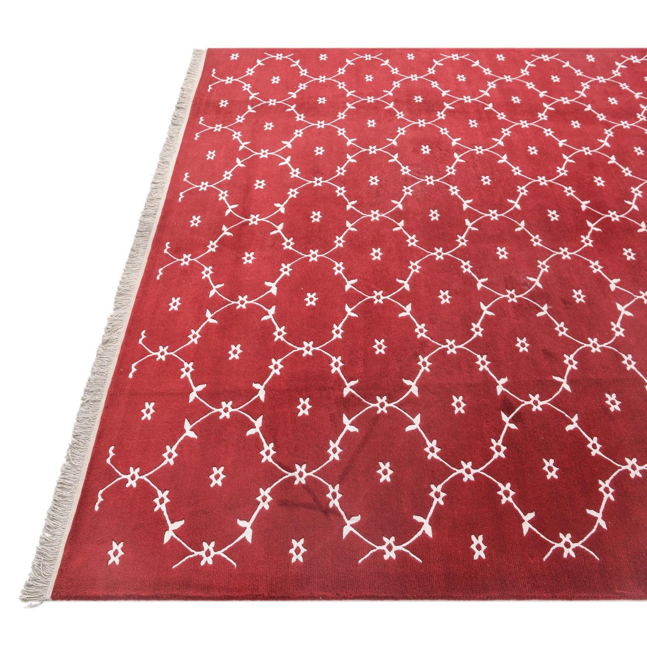 The Darya Collection offers a hand-knotted rug, meticulously crafted from 100% wool, sized at a versatile 8x11. This piece features an engaging pattern of ivory trellis work on a rich red background, creating a dynamic and attractive visual contrast. The pattern is composed of continuous geometric forms that deliver a sense of order and classic style.