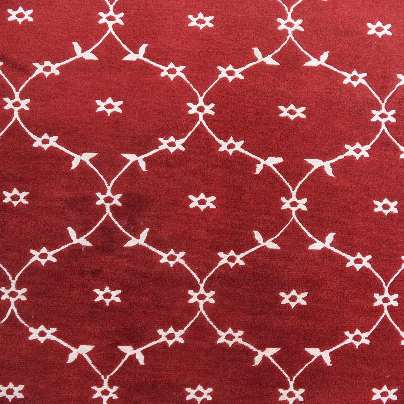 A rectangular 8x11 Darya rug in deep red with a repeating white modern oriental pattern and fringe.