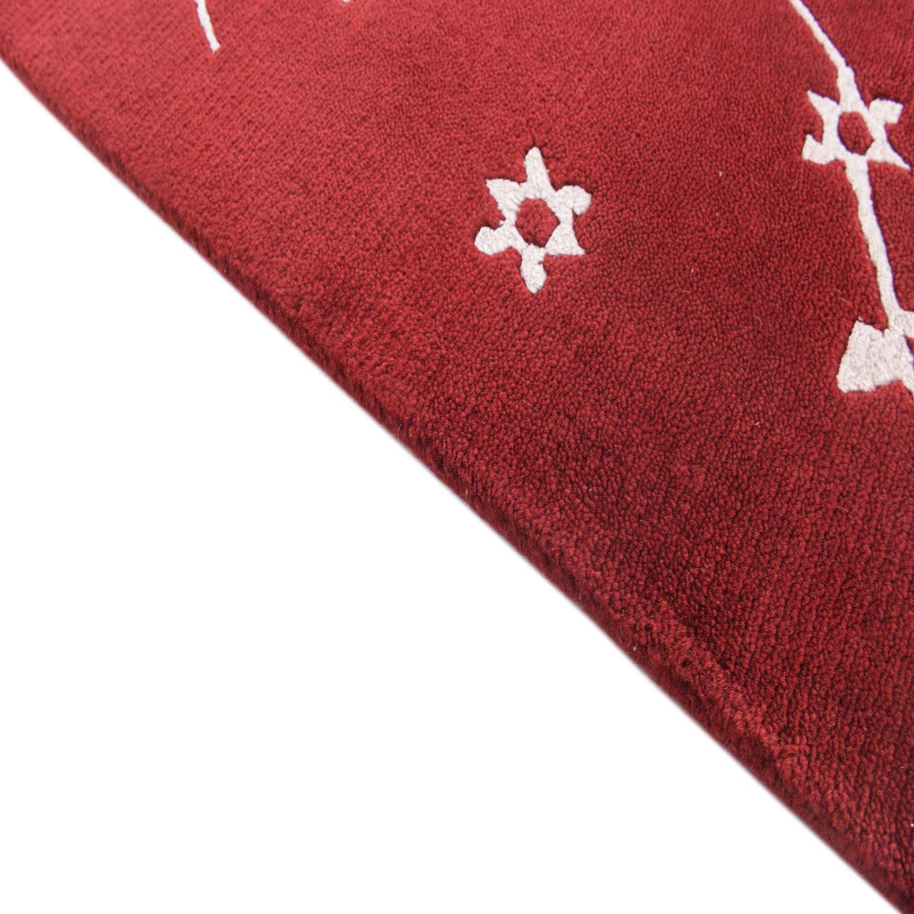 Ideal for incorporating into traditional and contemporary spaces alike, this rug would complement wood flooring, add depth to a neutral palette, or serve as a sophisticated anchor in a minimalist setting. The bold red can also coordinate well with similarly warm tones or serve as a striking counterpart to cooler hues, making it a versatile addition to a living room, dining area, or larger bedroom.