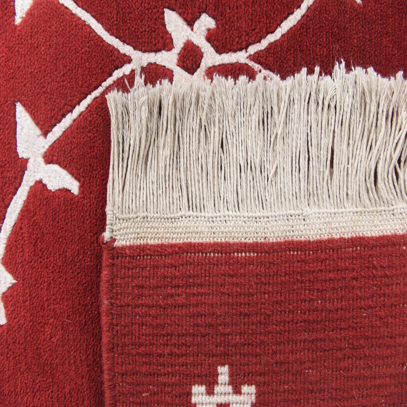 The red and ivory color scheme of the rug is a strong statement, providing warmth and a focal point in a variety of interior settings. The wool texture offers a soft, comforting feel underfoot while also ensuring durability for high-traffic areas.