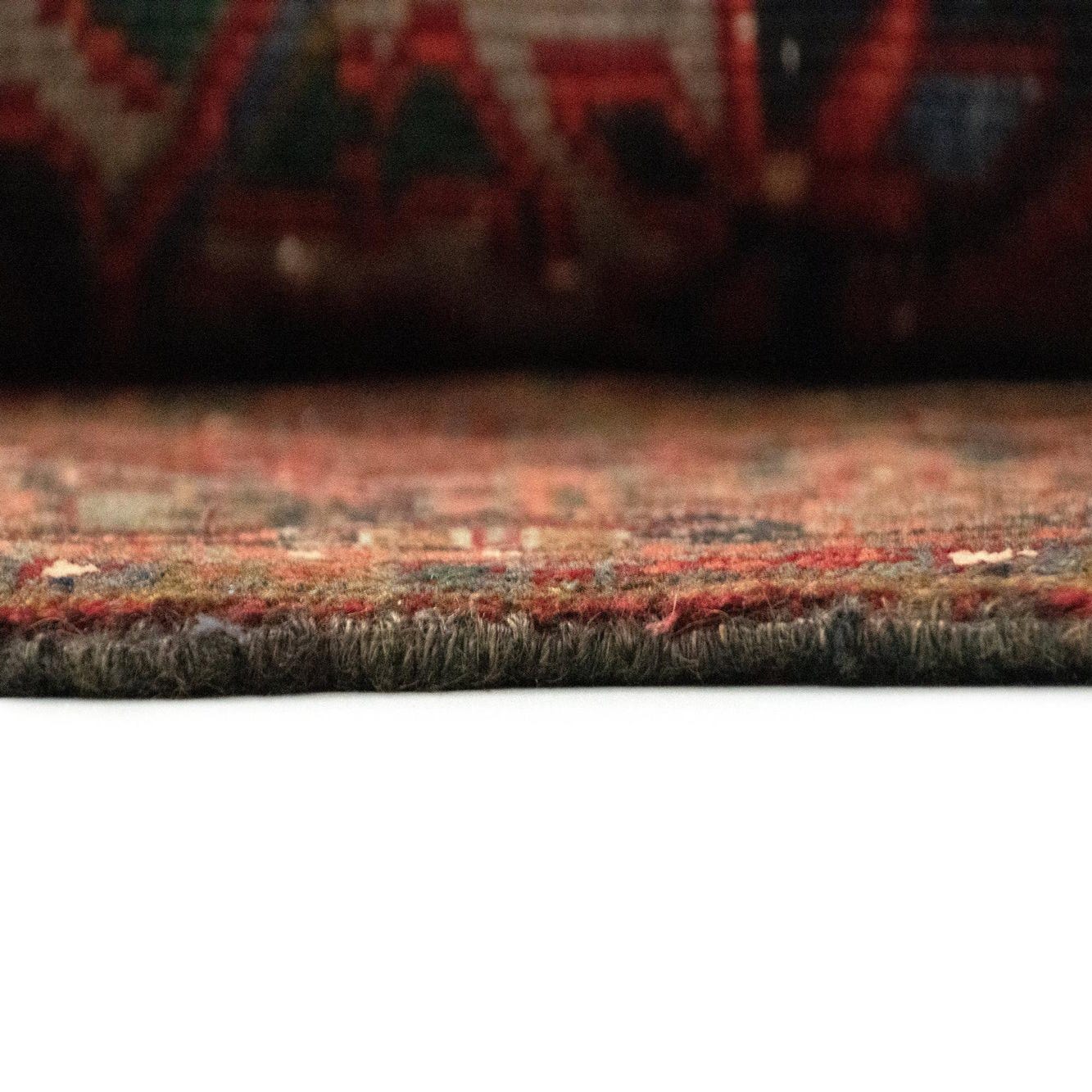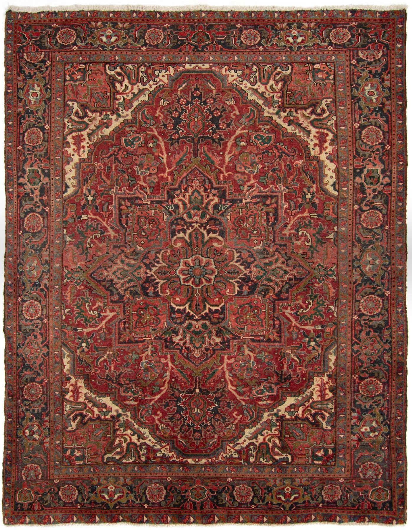 This Heriz rug, handcrafted from 100% wool, showcases a traditional design with a deep red background that anchors the intricate pattern. The texture of wool adds depth and warmth to the piece. The medallion and corner bracket motifs use a rich palette of red, dark blue, cream, and green to create a harmonious design. This 8x11 rug has a robust color scheme and classic style that would complement a variety of interiors, including formal sitting rooms, dining areas with traditional furnishings, or studies adorned with rich woods and leather accents. The hand-made construction ensures durability and an authentic artisan touch to any space it graces.