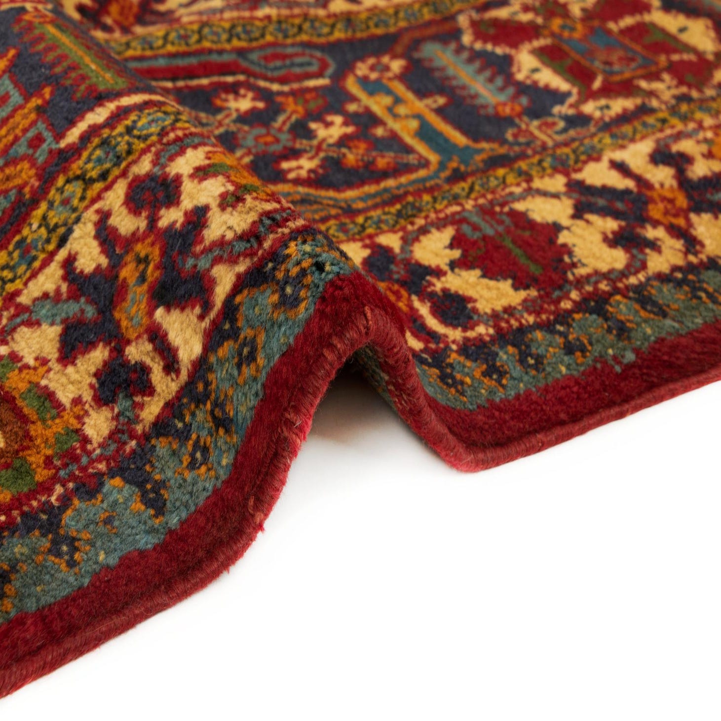 Primary color is Red. Colors in this rug include: Red, Red, Brown, Green, Black.