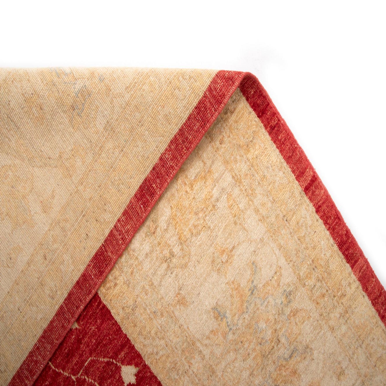 The Kaizar collection offers a hand-made rug crafted from 100% wool, presenting a luxurious texture underfoot. This particular piece measures 8x11 and showcases a rich red background that commands attention. Upon this vibrant backdrop are traditional motifs in shades of beige and cream, providing a contrast that is both striking and harmonious. The pattern includes intricate florals and curvilinear designs that evoke a sense of classical elegance.