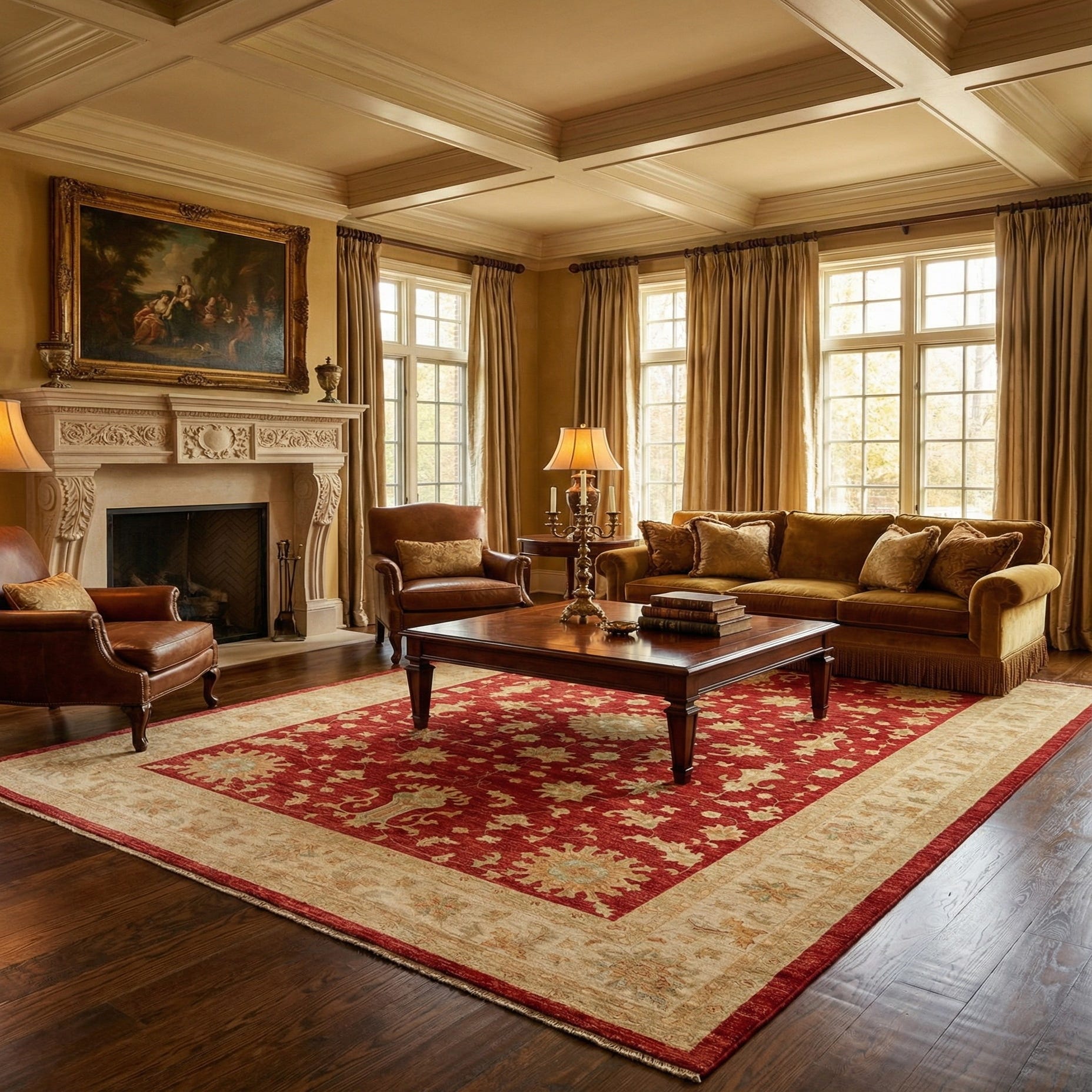 With its classic color palette and enduring style, this rug would be a fitting choice for spaces that seek to project elegance and timelessness, such as formal living rooms, dining rooms, or libraries. It would harmonize beautifully with rich wood tones and leather furnishings, thus enhancing traditional decors, or it could serve as a striking contrast in a more modern setting that embraces bold colors and mix-and-match patterns.